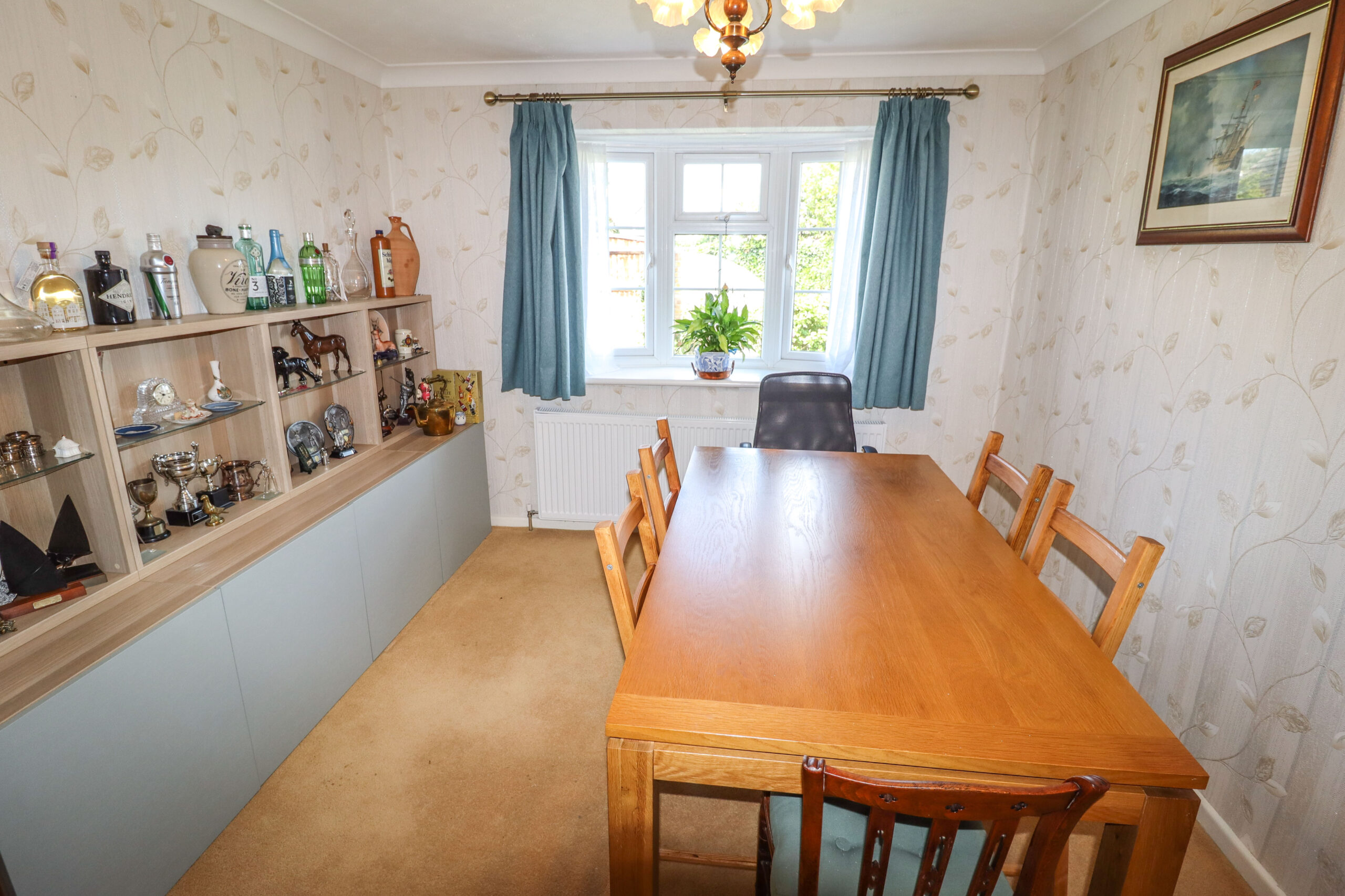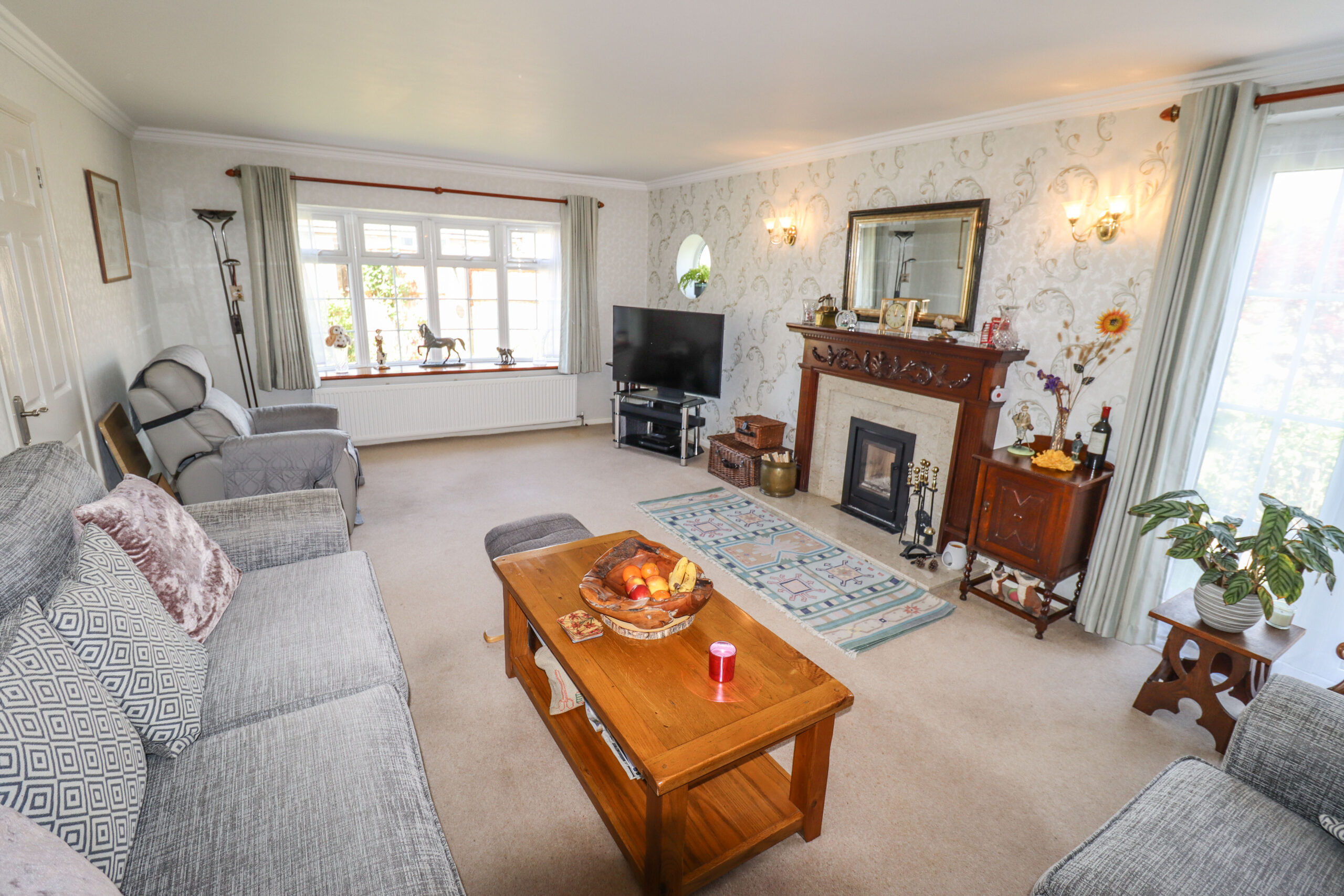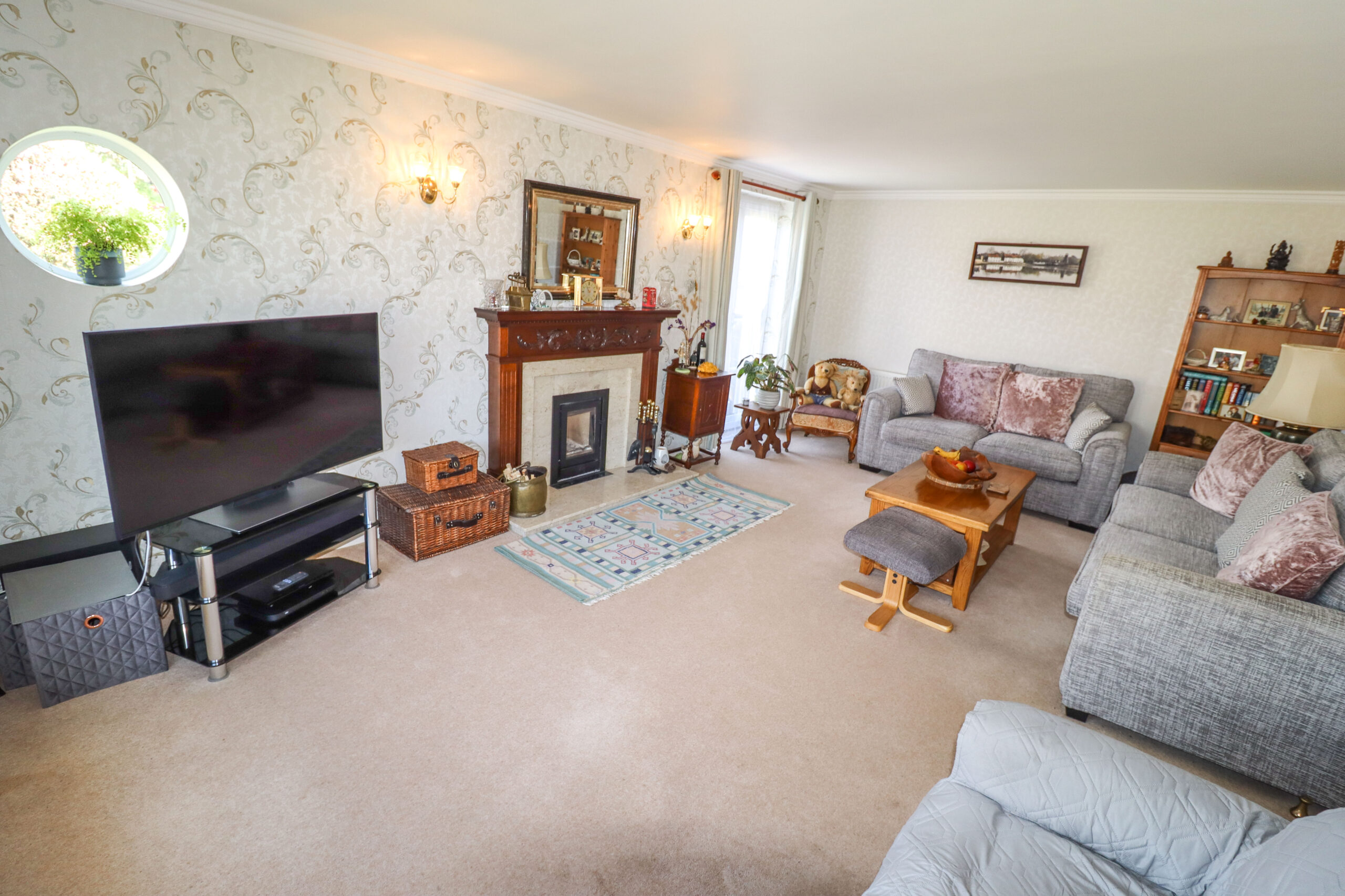 20’9” x 12’9” (6.32m x 3.88m) Wide UPVC double glazed window in a half bay to the front. Two radiators. Television point. Two wall lights. Feature inset cast iron log burner with an attractive surround. Coved ceiling. UPVC double glazed French doors to the side. Feature double glazed porthole style window to the side.