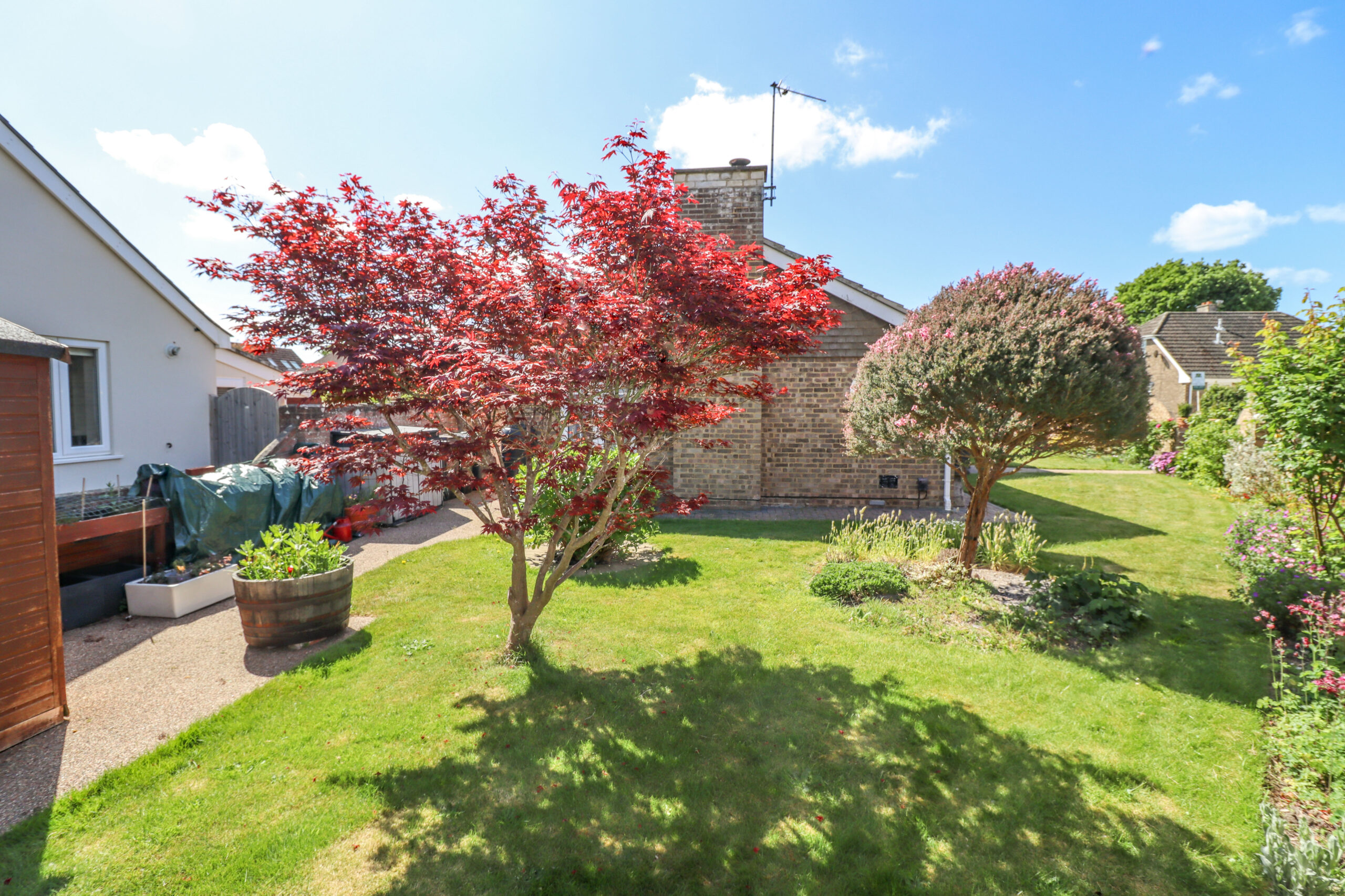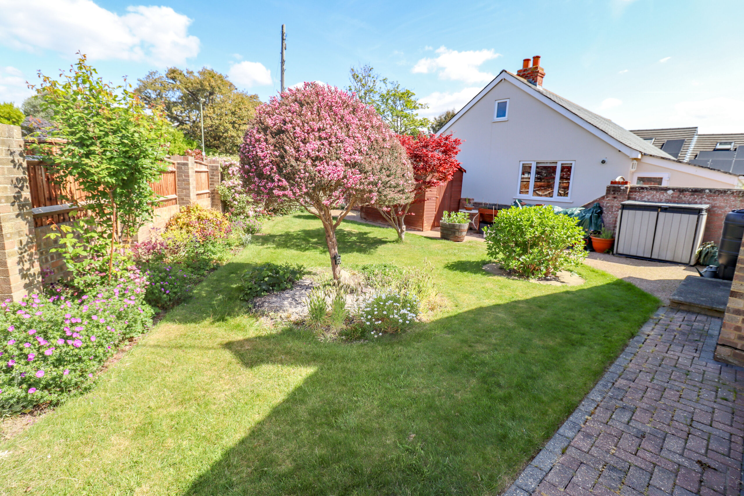 The front garden is laid to lawn. Shrubs and bushes. Well-stocked borders. The south facing pretty side garden is also laid to lawn. Well-stocked borders. Greenhouse. Paved patio area. Mature trees, shrubs and bushes. The mature side garden is laid to lawn. Timber garden shed. Mature trees, shrubs and bushes. Ideal gardens for either children or the keen gardener.