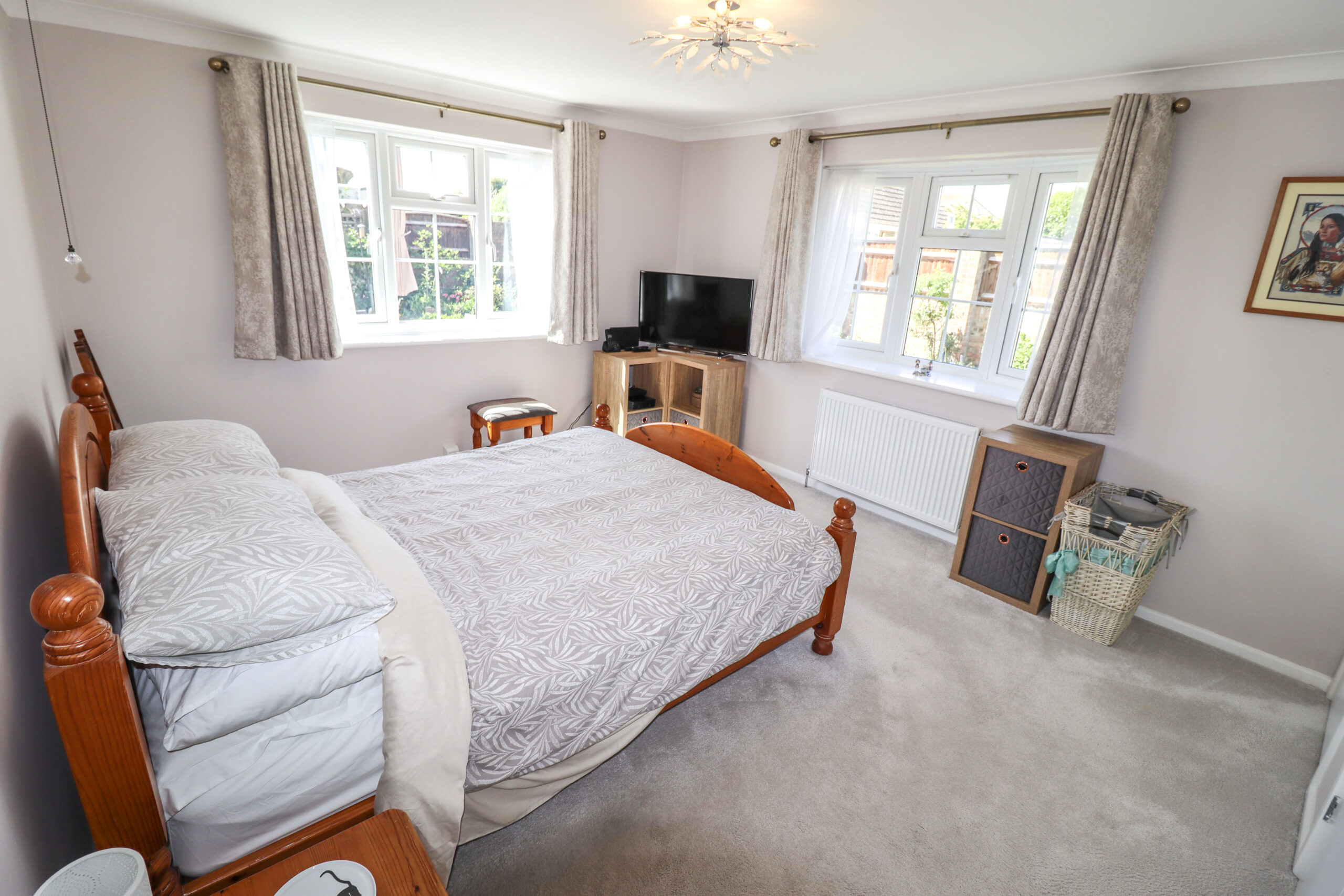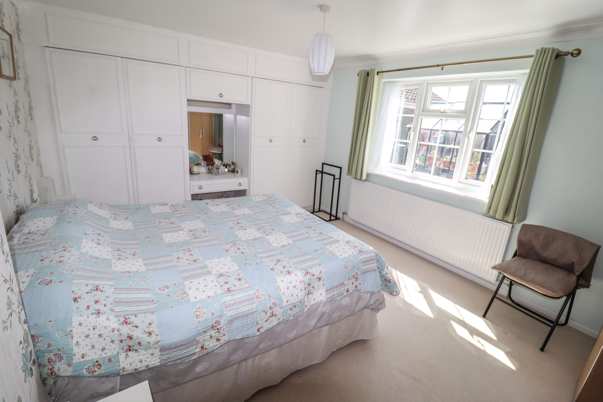 13’4” x 11’5” (4.06m x 3.47m) UPVC double glazed window to the side, (with pleasant views over the gardens). One wall fitted with wardrobes. Coved ceiling. Radiator.