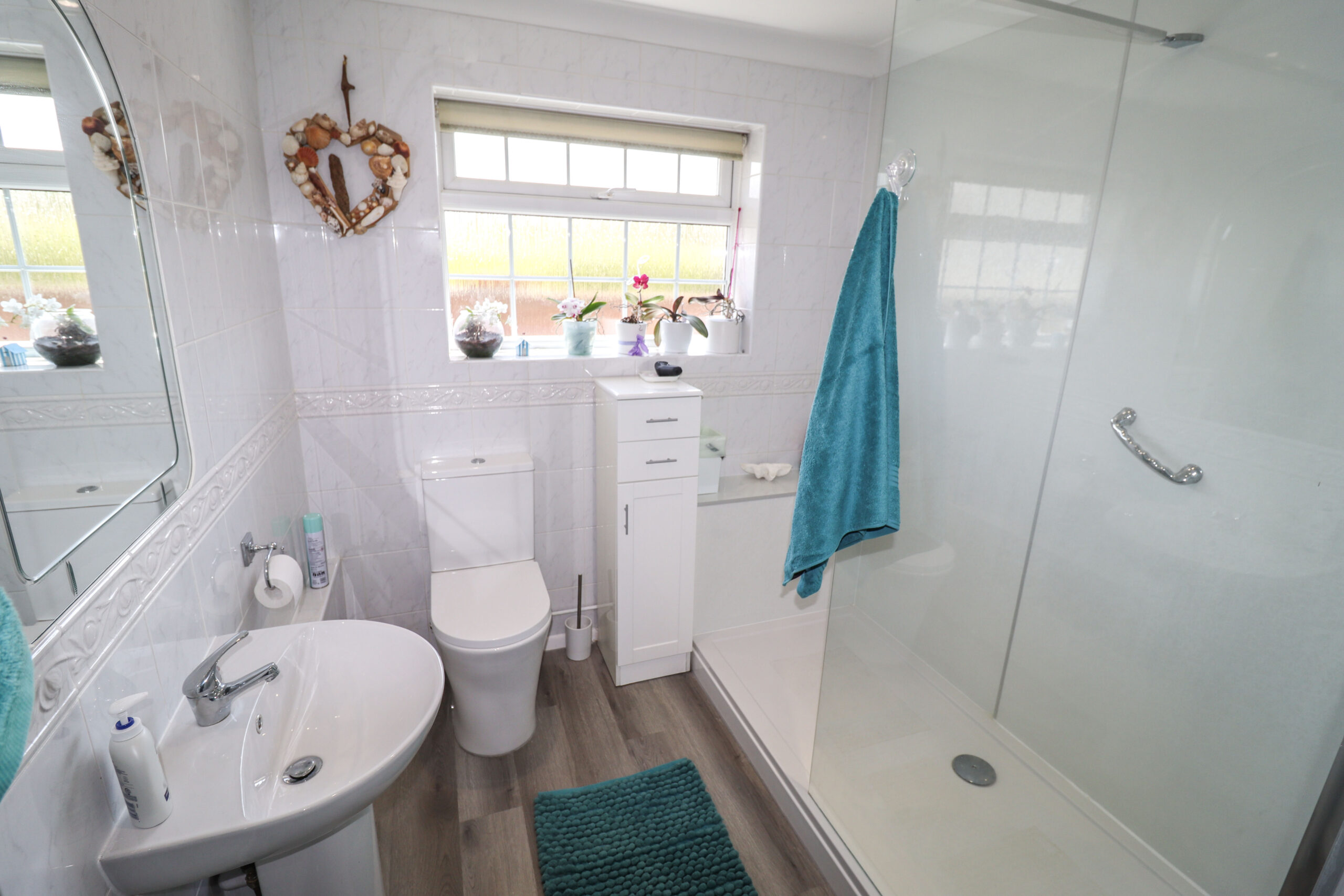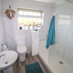 Fitted with an attractive white suite. Low level WC. Pedestal wash hand basin with mixer taps. Wide fully tiled shower enclosure with a mixer shower. Chrome heated towel rail / radiator. Walls fully tiled. Coved ceiling. Inset ceiling spotlights. Extractor. Laminated wood flooring. UPVC double glazed window with obscured glass to the rear. Fitted mirror. Built in cupboard which has space for a tumble dryer.