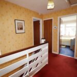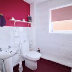 12’5” x 9’10” (3.79m x 2.99m) max into the door recess. Wide UPVC double glazed window to the rear. Pedestal wash hand basin with splashback tiles. Fitted mirror. Coved ceiling. Radiator.