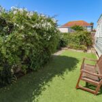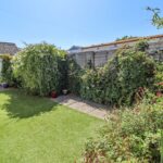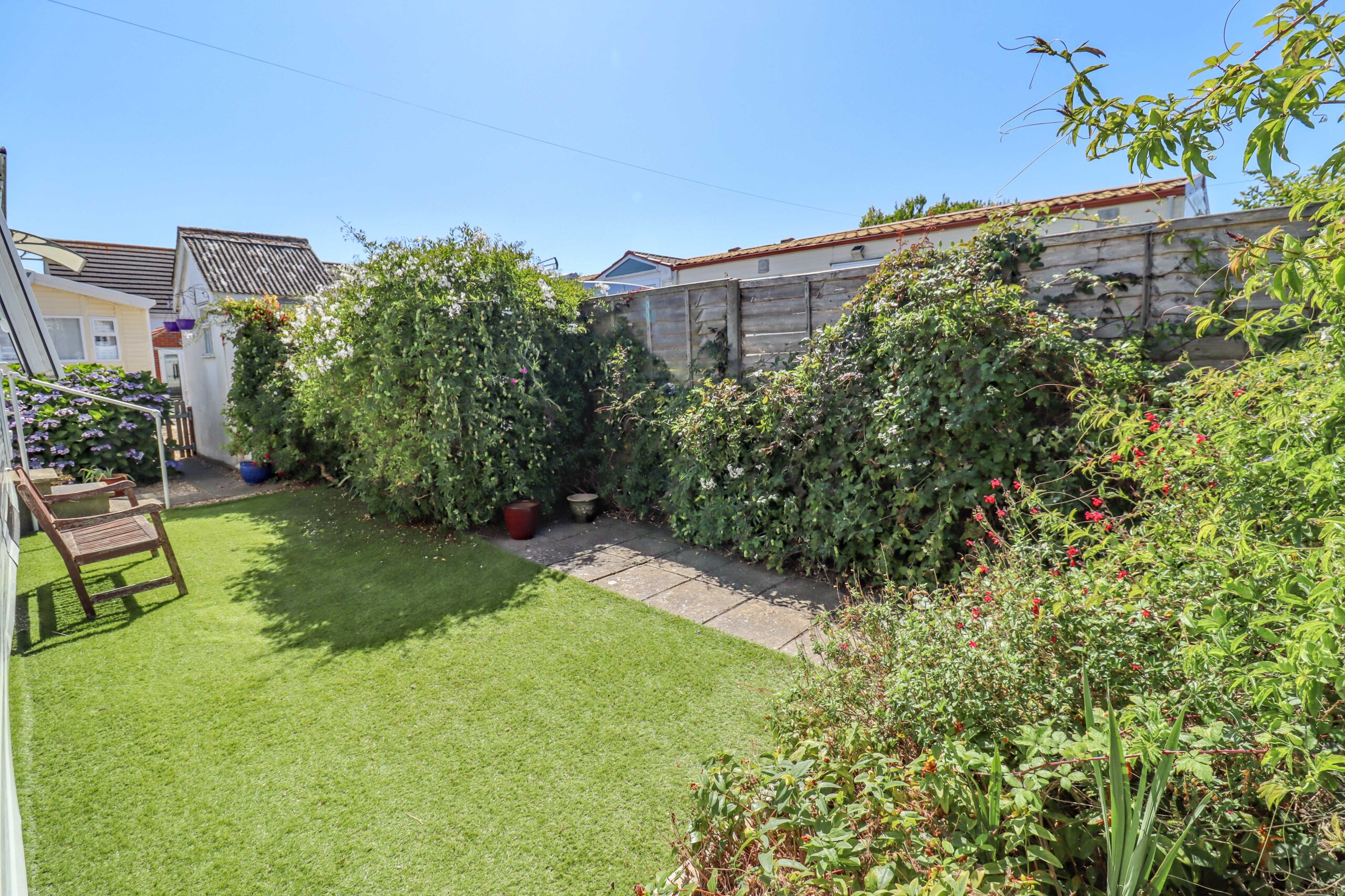 Off road car parking space to the side. Area of artificial grass. Small paved patio area. Raised borders. Shrubs and bushes. Shed. Brick built shed.