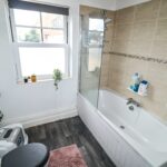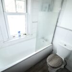 Fitted with a white suite. Low level WC. Pedestal wash hand basin with mixer taps and splashback tiles. Panelled bath with centre mixer taps and a Triton shower over. Side screen. Walls fully tiled to the bath area. Chrome heated towel rail/radiator. Extractor. UPVC double glazed window with obscured glass to the front.