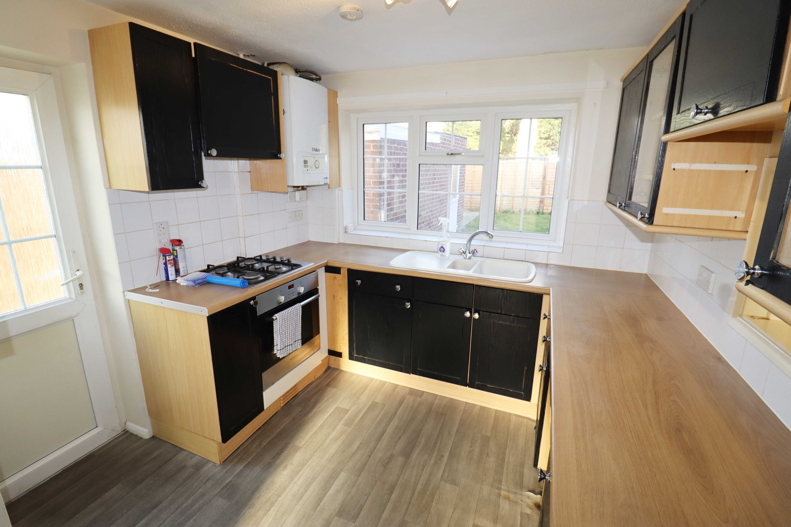 10’10” x 9’5” (3.30m x 2.87m) Fitted on three sides. Range of worktops with drawers and cupboards under. Inset one and a quarter bowl sink unit with mixer taps and a cupboard under. Matching high level cupboards, (including a display cupboard). Built in Bosch stainless steel oven with an inset four ring stainless steel gas hob above. Concealed extractor over. Recess with plumbing for a washing machine. Recess for a fridge/freezer. Walls part tiled. Wall hung Vaillant gas boiler. Radiator. Serving hatch through to the lounge/diner. UPVC double glazed window with pleasant views over the rear garden. Built in cupboard. Three multi-directional ceiling spotlights. UPVC double glazed door to the side.