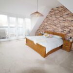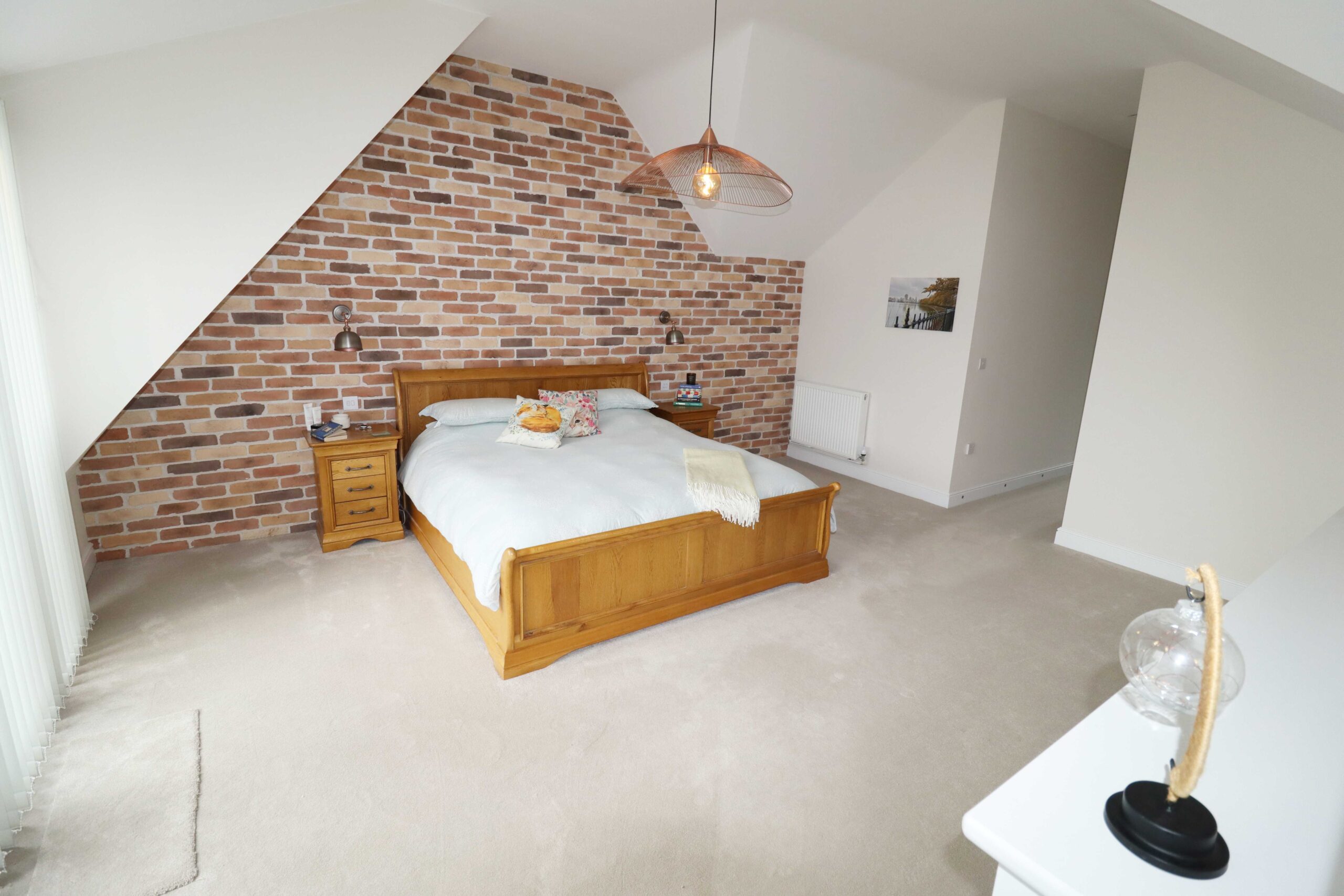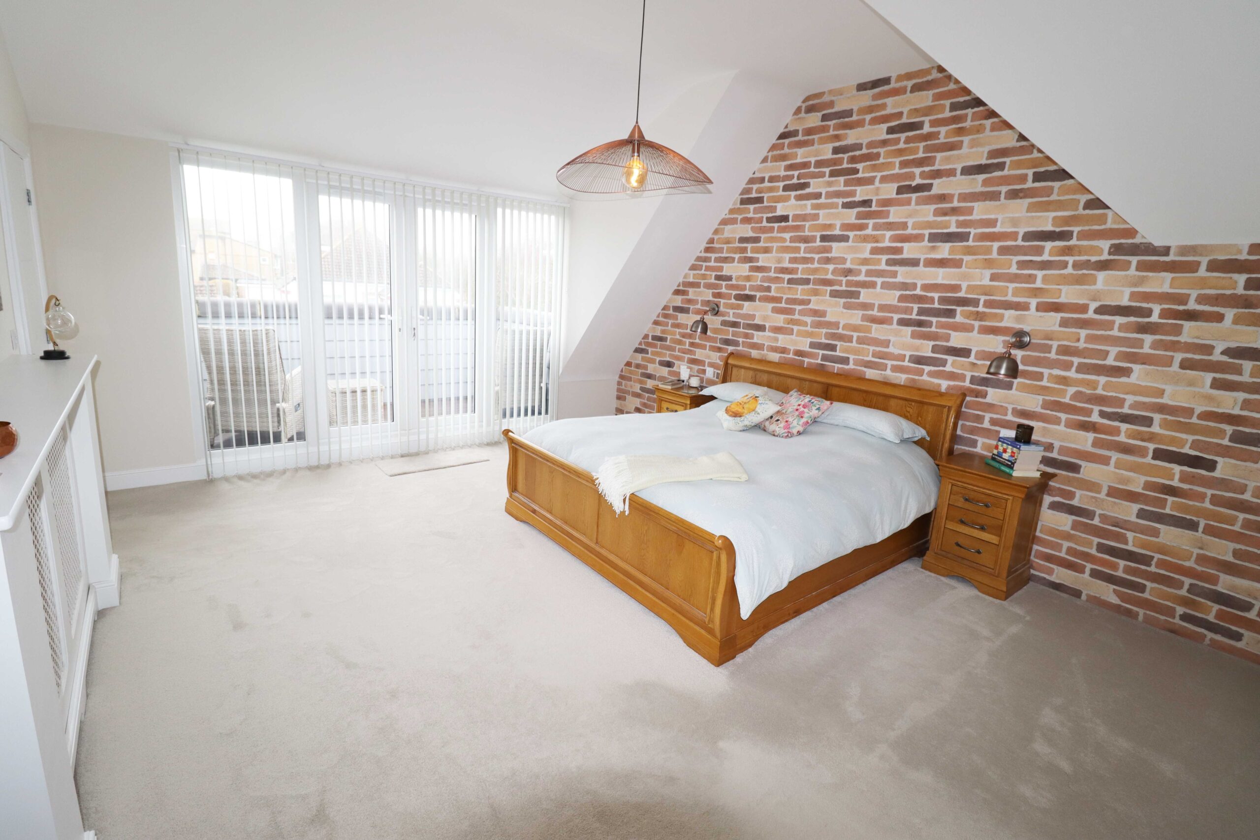 17’6” x 14’5” (5.33m x 4.39m) Vaulted ceiling. One wall as a feature exposed brickwork. Two radiators, (one with a fitted cover). UPVC double glazed French doors, (with two UPVC double glazed side windows), to the West facing balcony. Access through to the small hallway, (which has low level lighting). Doors to: