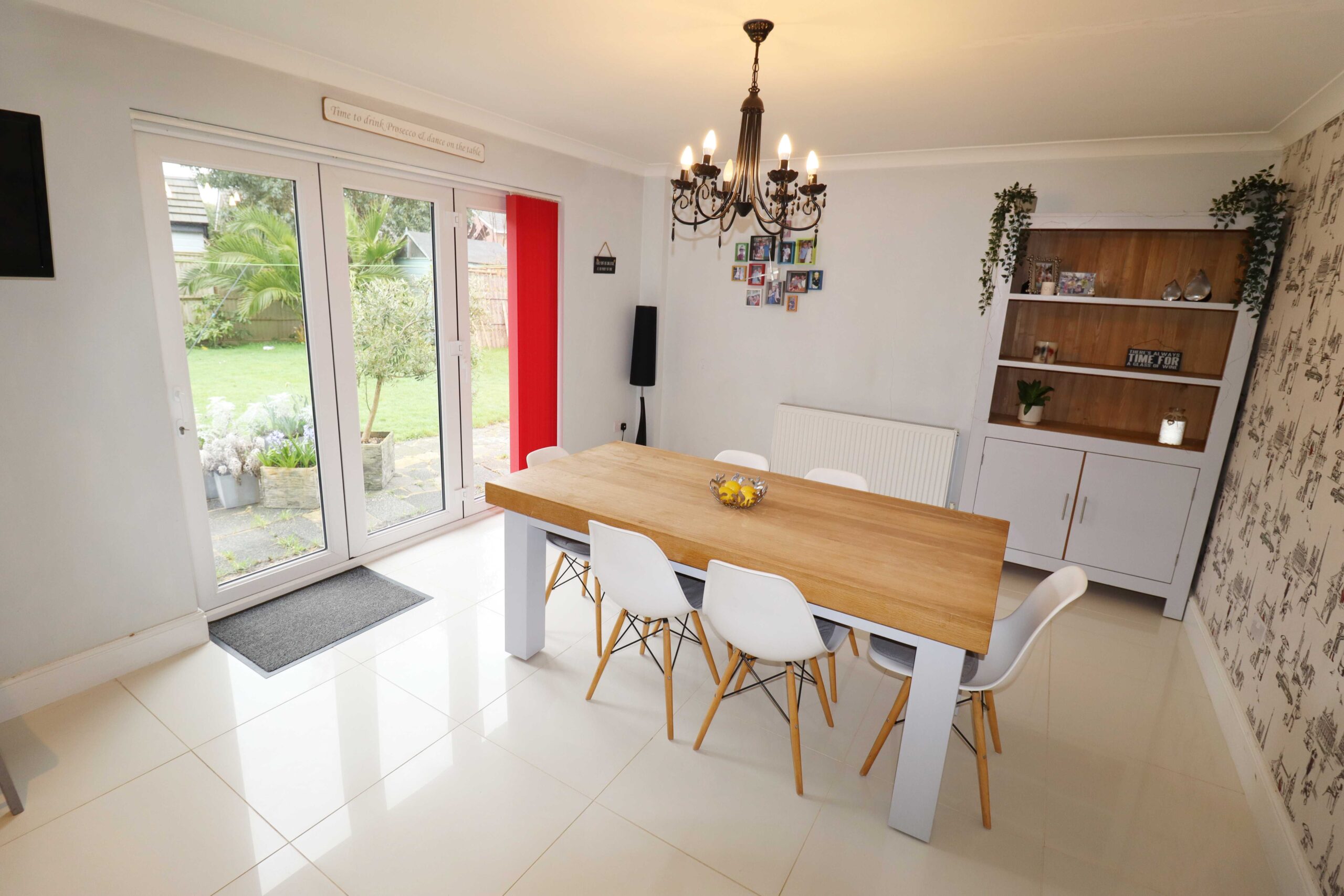 25’7” x 11’4” (7.79m x 3.45m) The kitchen area is fitted on three sides with attractive units. Range of worktops with drawers and cupboards under. Inset one and a quarter bowl single drainer sink with mixer taps and a cupboard under. Matching high level cupboards. Built in eye level AEG stainless steel double oven. Built in high level stainless steel microwave. Inset Induction hob with a stainless steel extractor over. Integral fridge/freezer. Integral dishwasher. Matching breakfast bar. Built in wine cooler. Plinth lighting. Porcelain tiled flooring. Coved ceiling. Inset ceiling spotlights. Television point. UPVC double glazed window with pleasant views over the rear garden. Access through to the utility room. The breakfast area has UPVC double glazed bi-fold doors to the rear garden. Porcelain tiled flooring. Coved ceiling. Radiator.