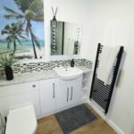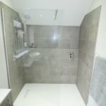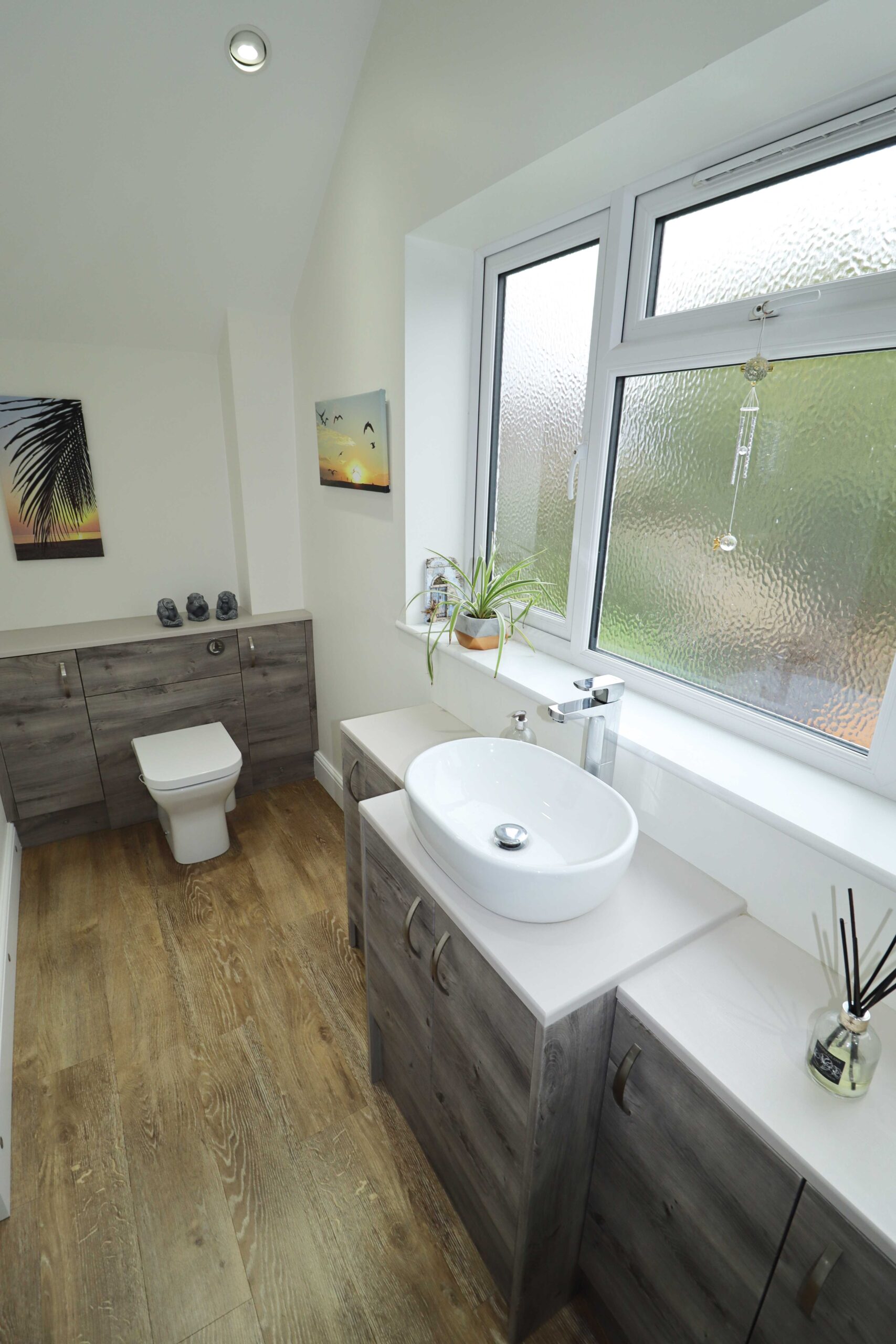 Fitted with an attractive white suite. Low level WC. Feature vanity wash hand basin with mixer taps, splashback tiles and a cupboard under. Heated towel rail/radiator. Extractor. Porcelain tiled floor. High level UPVC double glazed window with obscured glass to the side.
