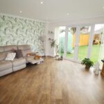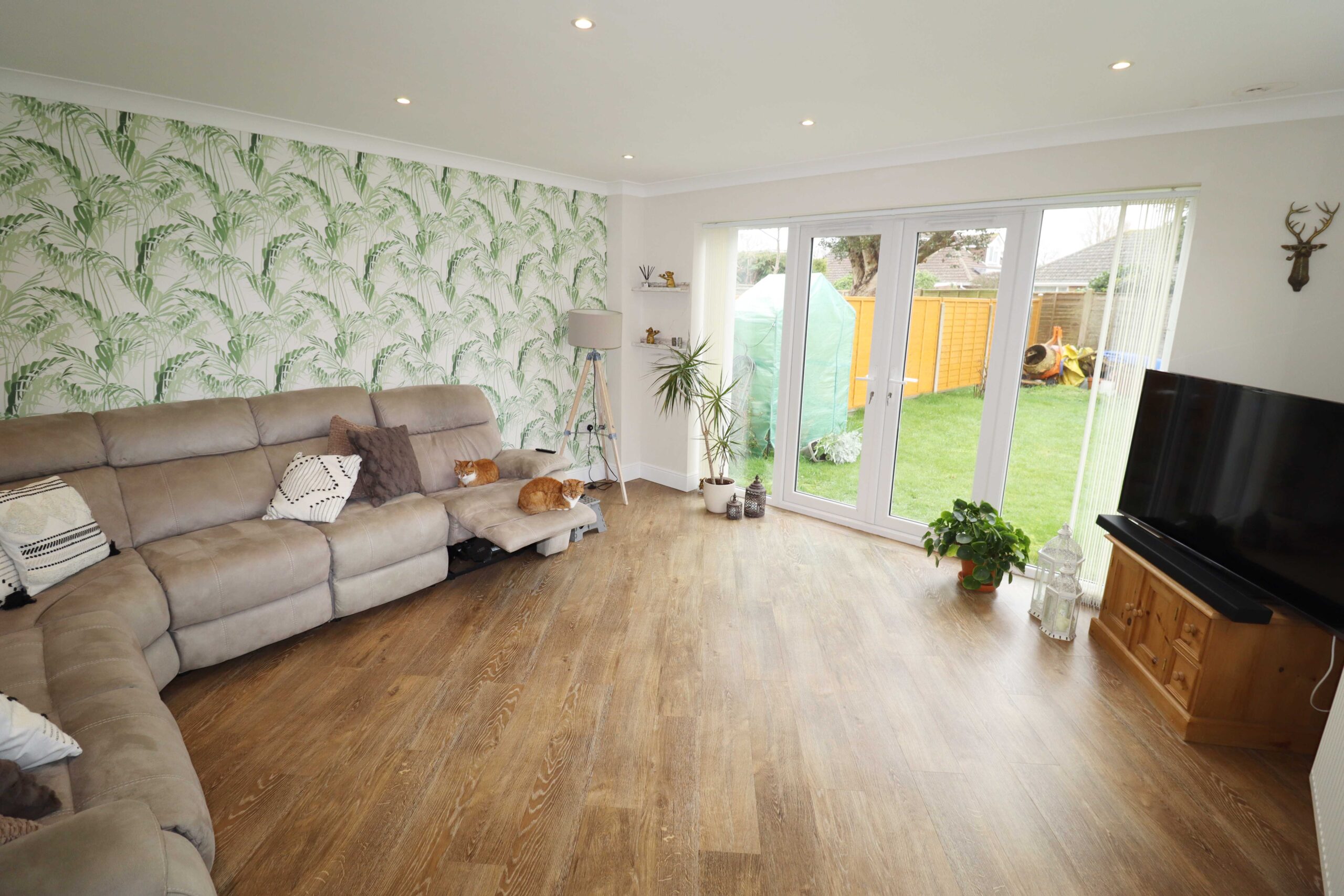 14’4” x 12’4” (4.36m x 3.75m) UPVC double glazed French doors, (with two UPVC double glazed side windows), to the rear garden. South facing UPVC double glazed window to the side. Television point. Feature Karndean flooring. Radiator. Coved ceiling. Inset ceiling spotlights. Dimmer switch.