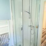 Fully tiled corner shower unit with sliding doors. Vanity unit along one wall with low level WC, inset wash hand basin with mixer taps and cupboards under. UPVC double glazed window with obscured glass. Inset ceiling lights. Walls part tiled. Heated towel rail.