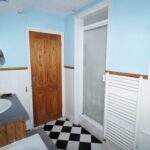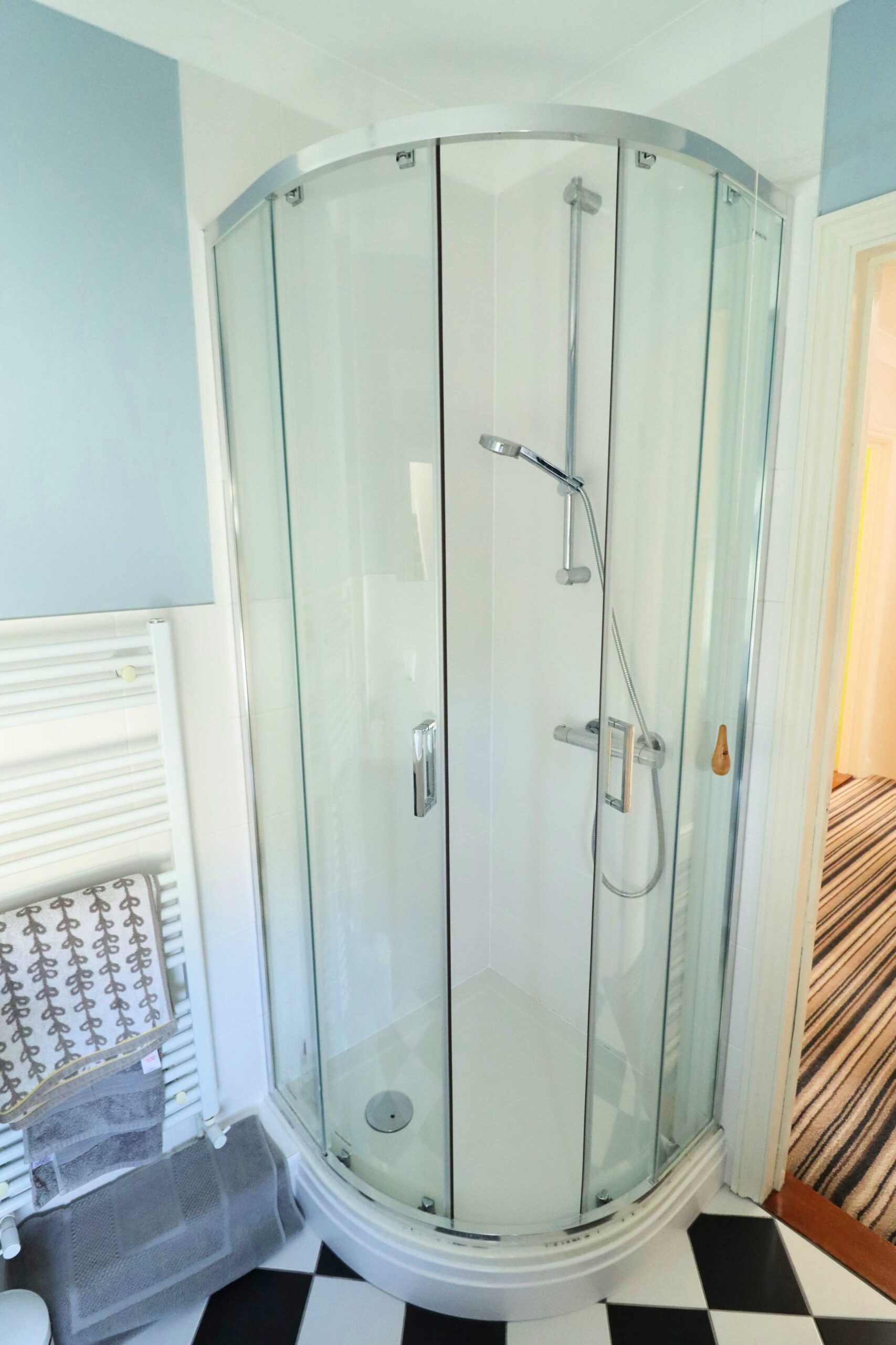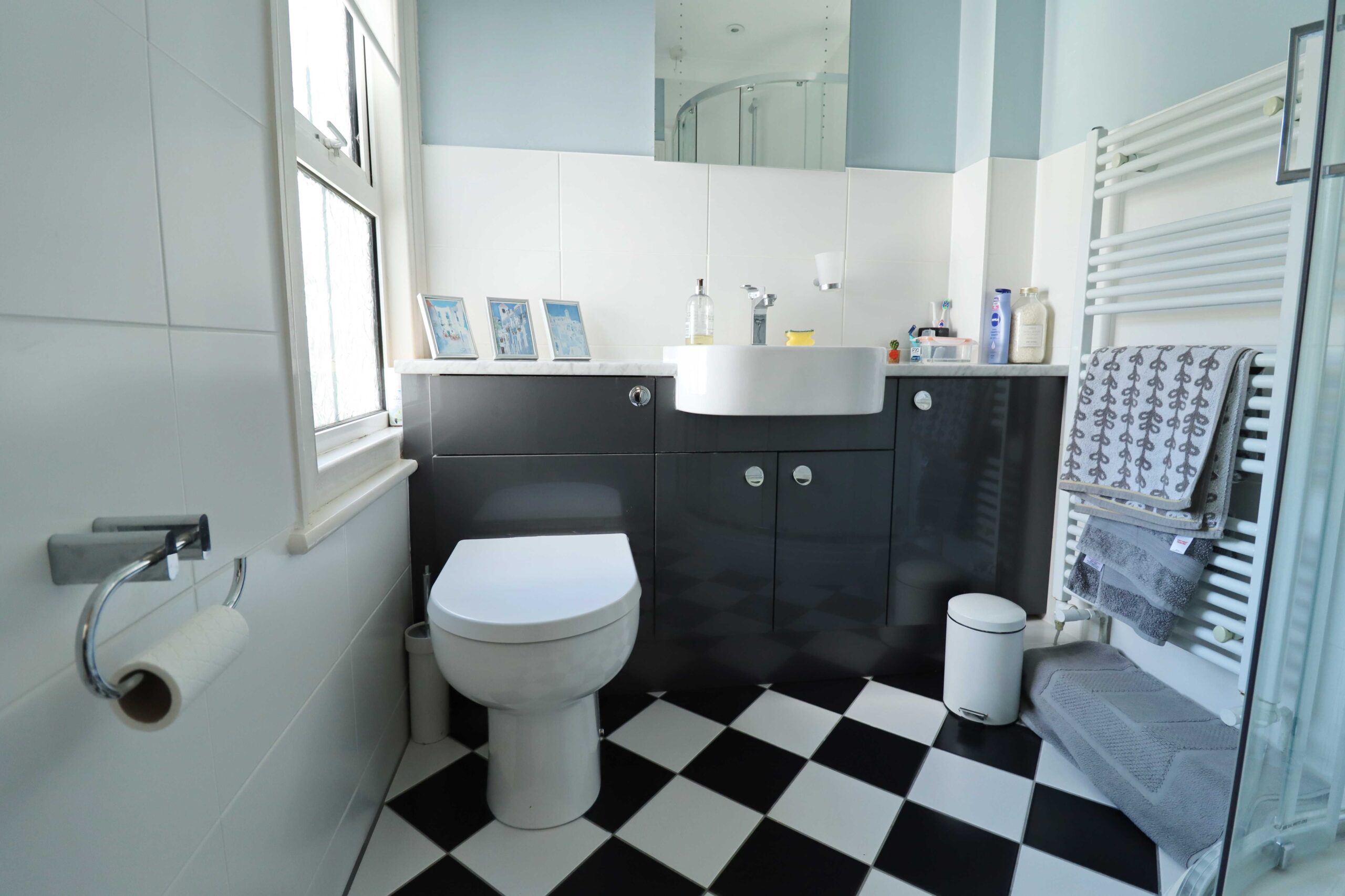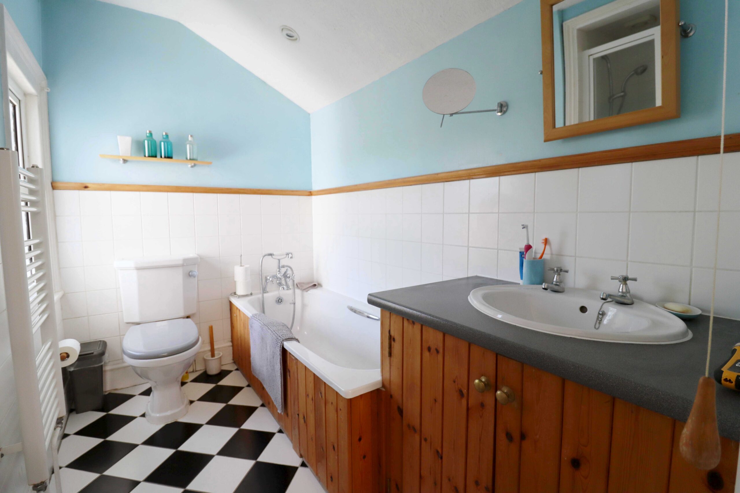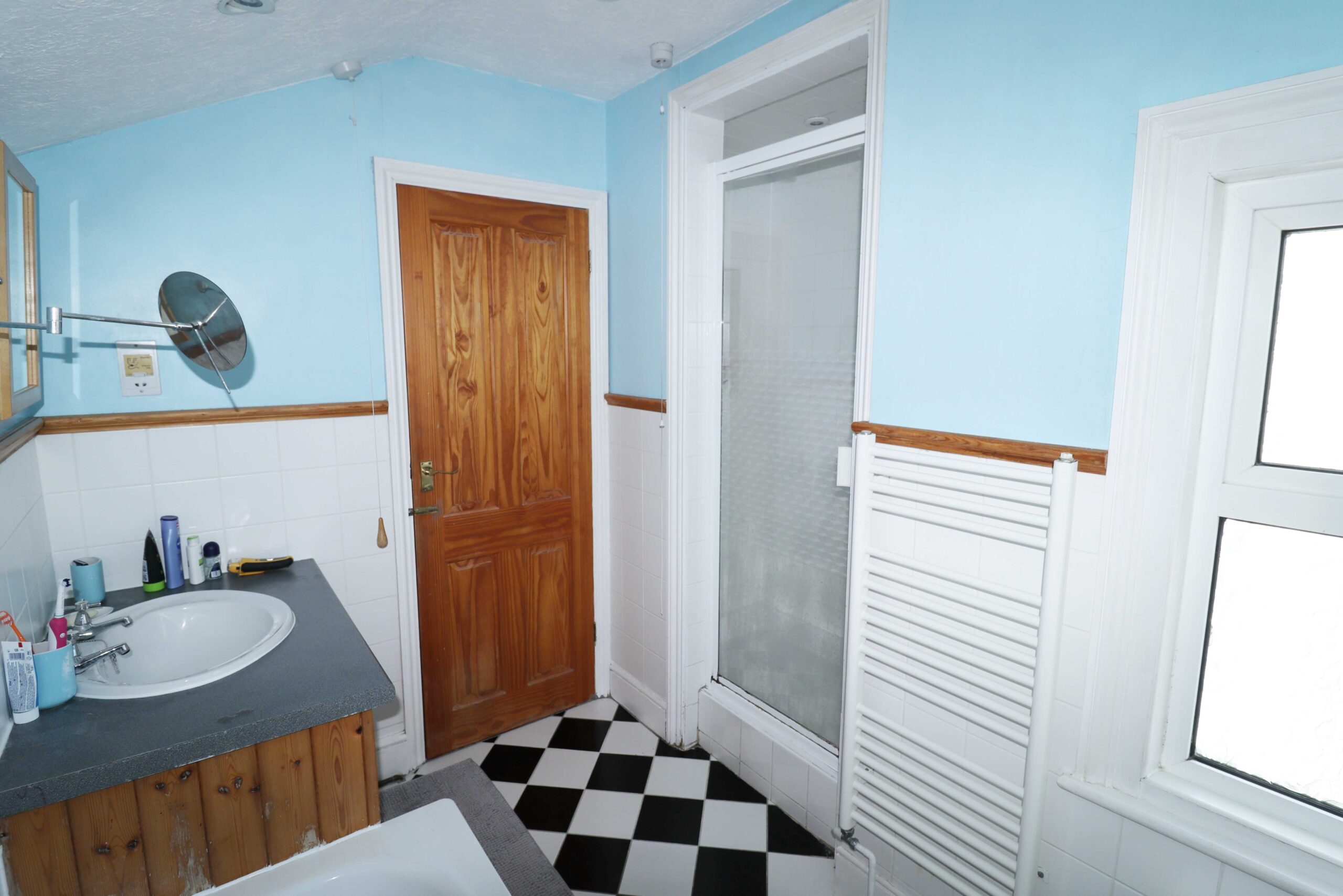 Fitted with a white suite. Low level WC. Vanity wash hand basin with a cupboard under. Panelled bath with telephone style mixer taps and a hand shower. Wide fully tiled shower enclosure with a Mira shower. Heated towel radiator. Walls half tiled. Ceramic tiled floor. Shaver point. Inset ceiling spotlights. Extractor. UPVC double glazed window with obscured glass to the front.