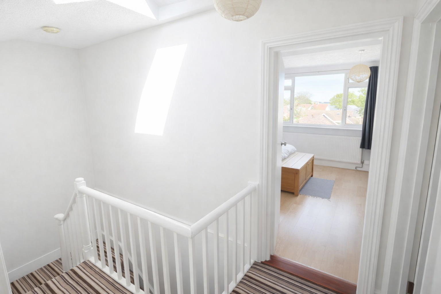 13’2” x 6’1” (4.01m x 1.85m) Was used as a kitchen but would make an ideal en-suite. Fitted on two sides. Range of worktops with drawers and cupboards under. Recess for a cooker. High level cupboards. Walls part tiled. Radiator. Southeast facing UPVC double glazed window with pleasant views over the rear garden. Double glazed Velux roof window to the side. Inset ceiling spotlights.