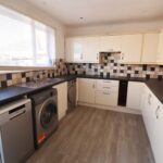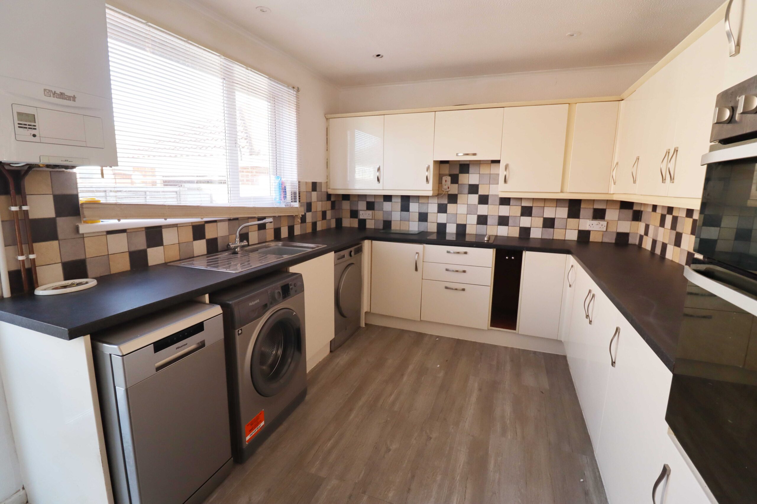 12’10” x 9’6” (3.91m x 2.89m) Fitted on three sides. Range of worktops with drawers and cupboards under. Inset single drainer sink unit with mixer taps and a cupboard under. Matching high level cupboards, (with concealed lighting under). Built in eye level Hotpoint double oven. Inset four ring Beko electric hob with a concealed extractor over. Recess with plumbing for a washing machine. Recess with plumbing for a dishwasher. Space for a fridge. Walls part tiled. Wall hung Vaillant gas boiler. Inset ceiling spotlights. UPVC double glazed window to the side. UPVC double glazed door with obscured glass to the side.