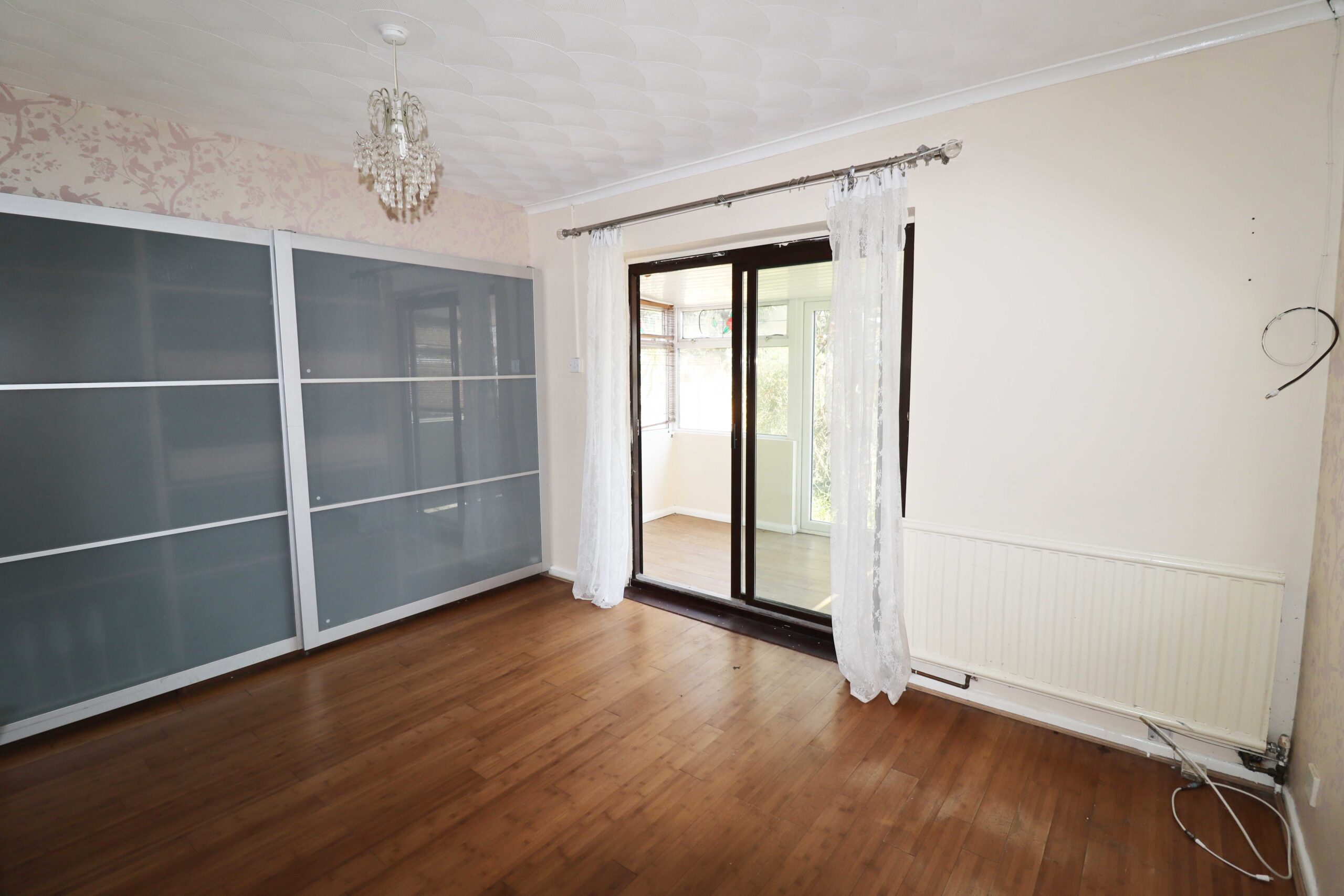 11’10” x 9’7” (3.60m x 2.92m) Radiator. Laminated wood flooring. Wall light. Full width double door built in wardrobe. Coved ceiling. Double glazed patio door to: