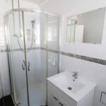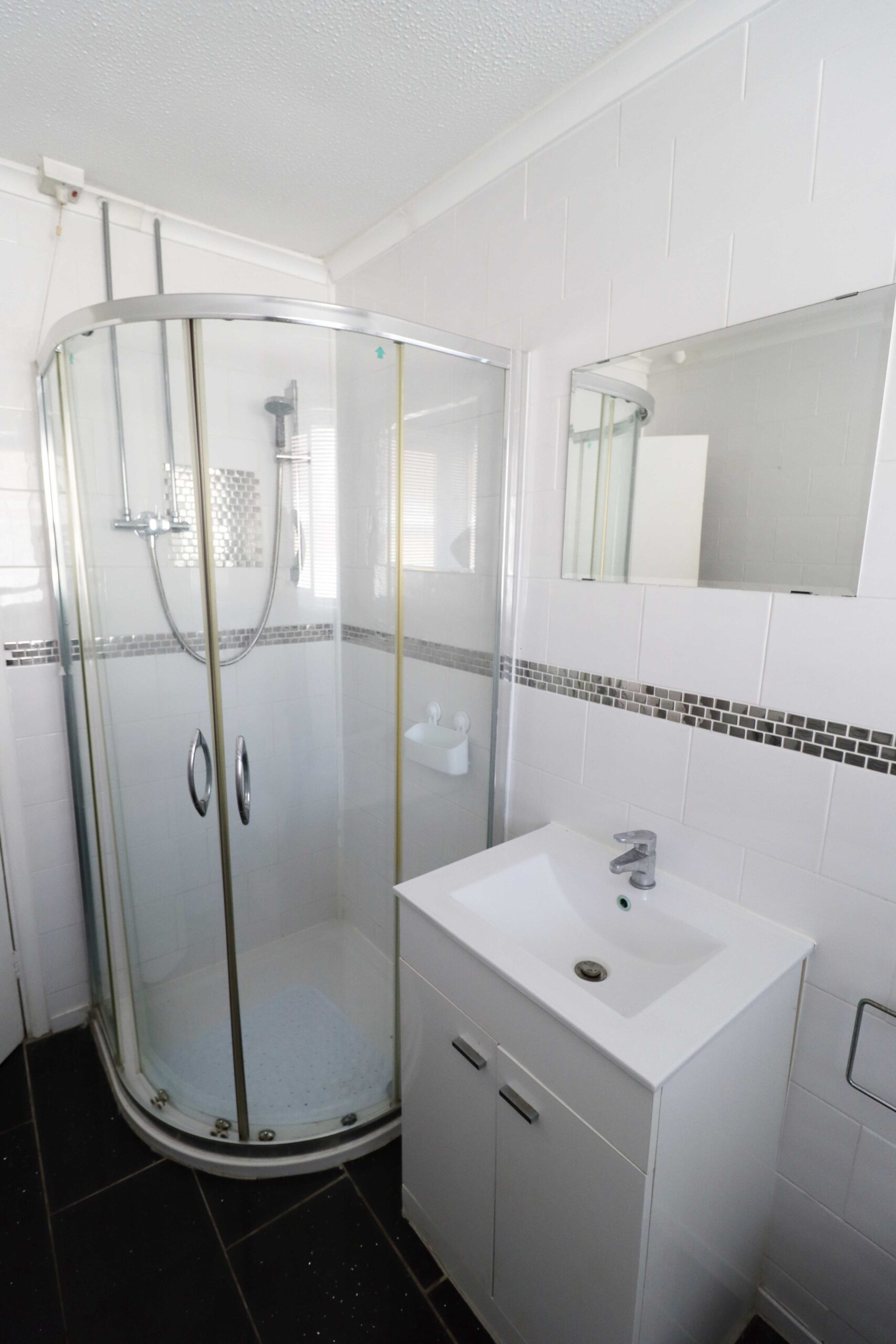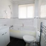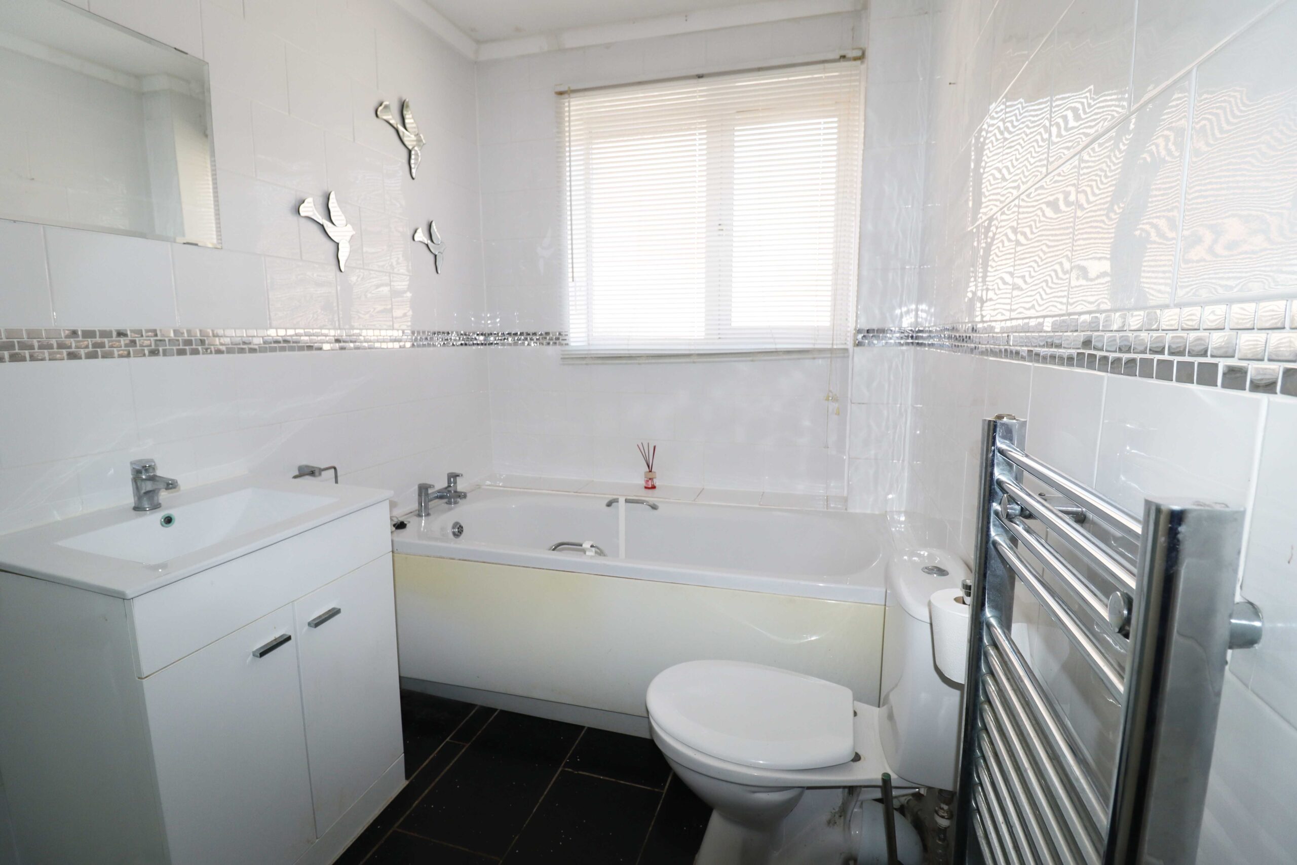 Fitted with a white suite. Low level WC. Feature vanity wash hand basin with mixer taps and a cupboard under. Panelled bath with mixer taps. Fully tiled shower enclosure with a Mira shower. Chrome heated towel rail/radiator. Walls fully tiled. Ceramic tiled floor. UPVC double glazed window with obscured glass to the side.
