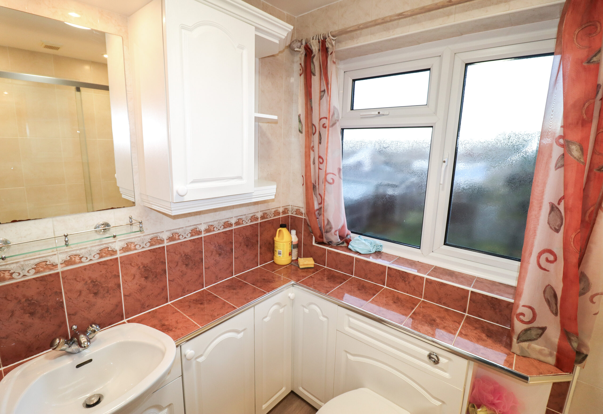 Fitted with an attractive white suite. Low level WC. Feature vanity wash hand basin with mixer taps and a cupboard under. Walls fully tiled. Radiator. Ceramic tiled floor. Feature arched south facing UPVC double glazed window with obscured glass to the front.