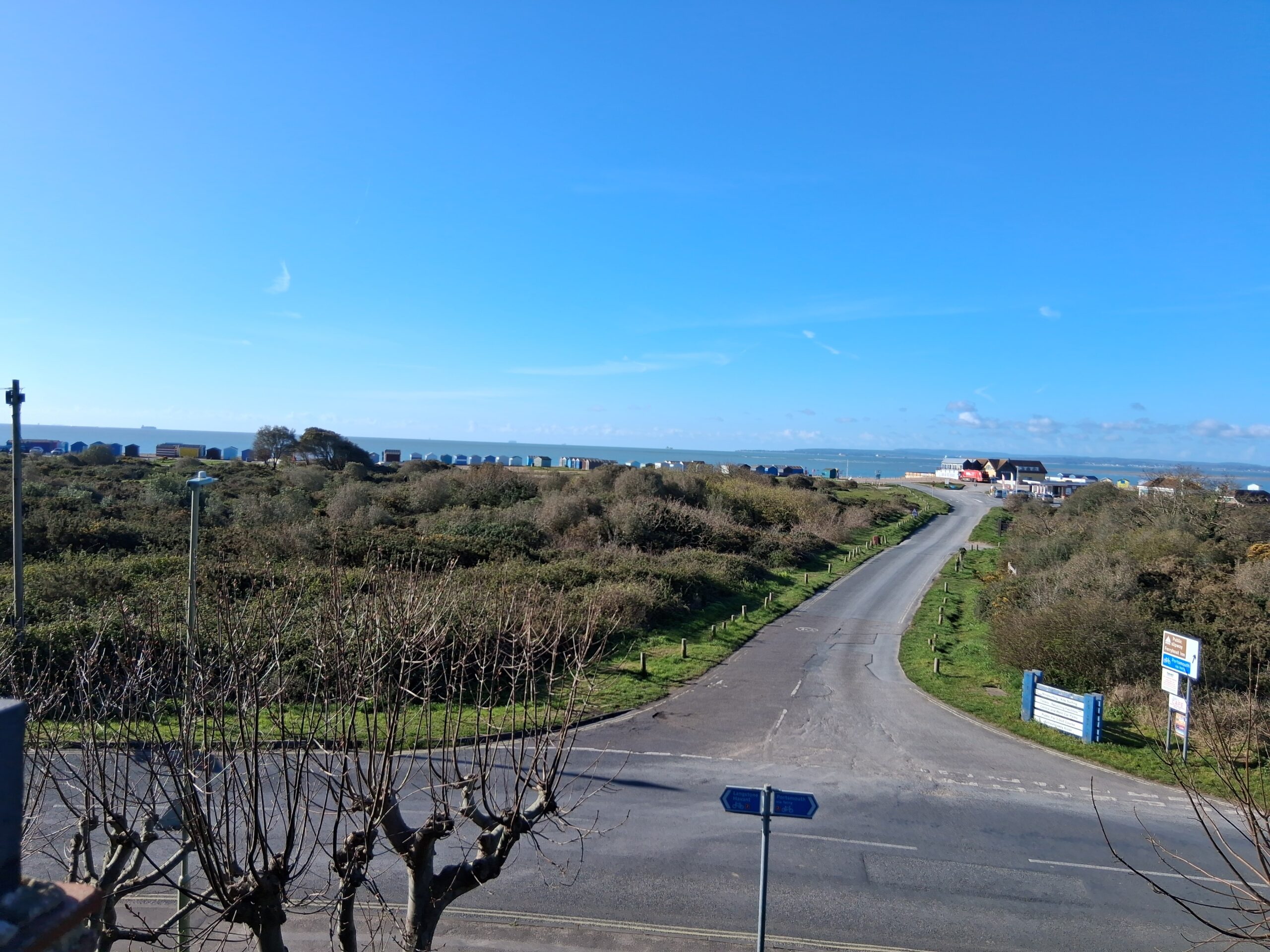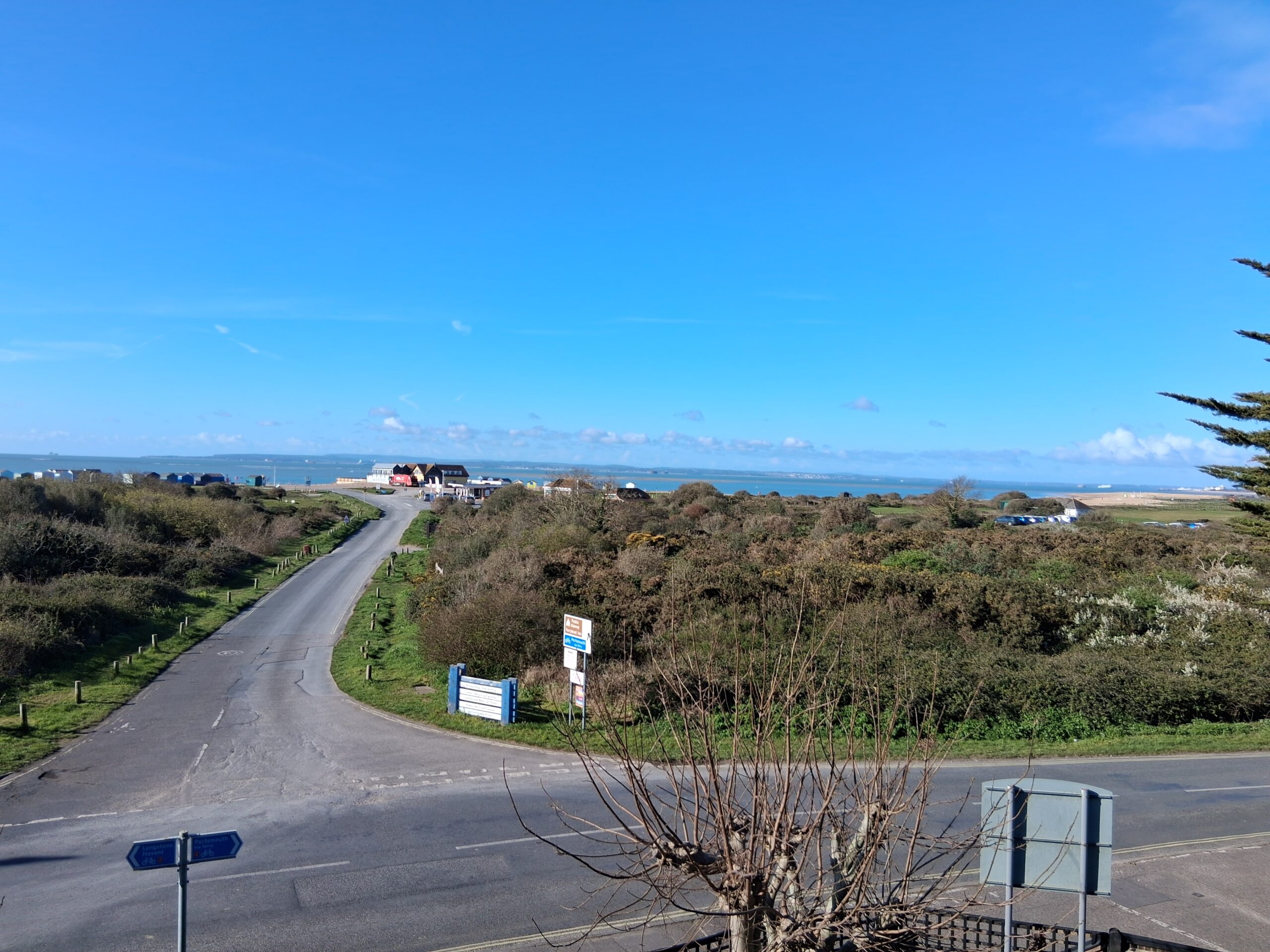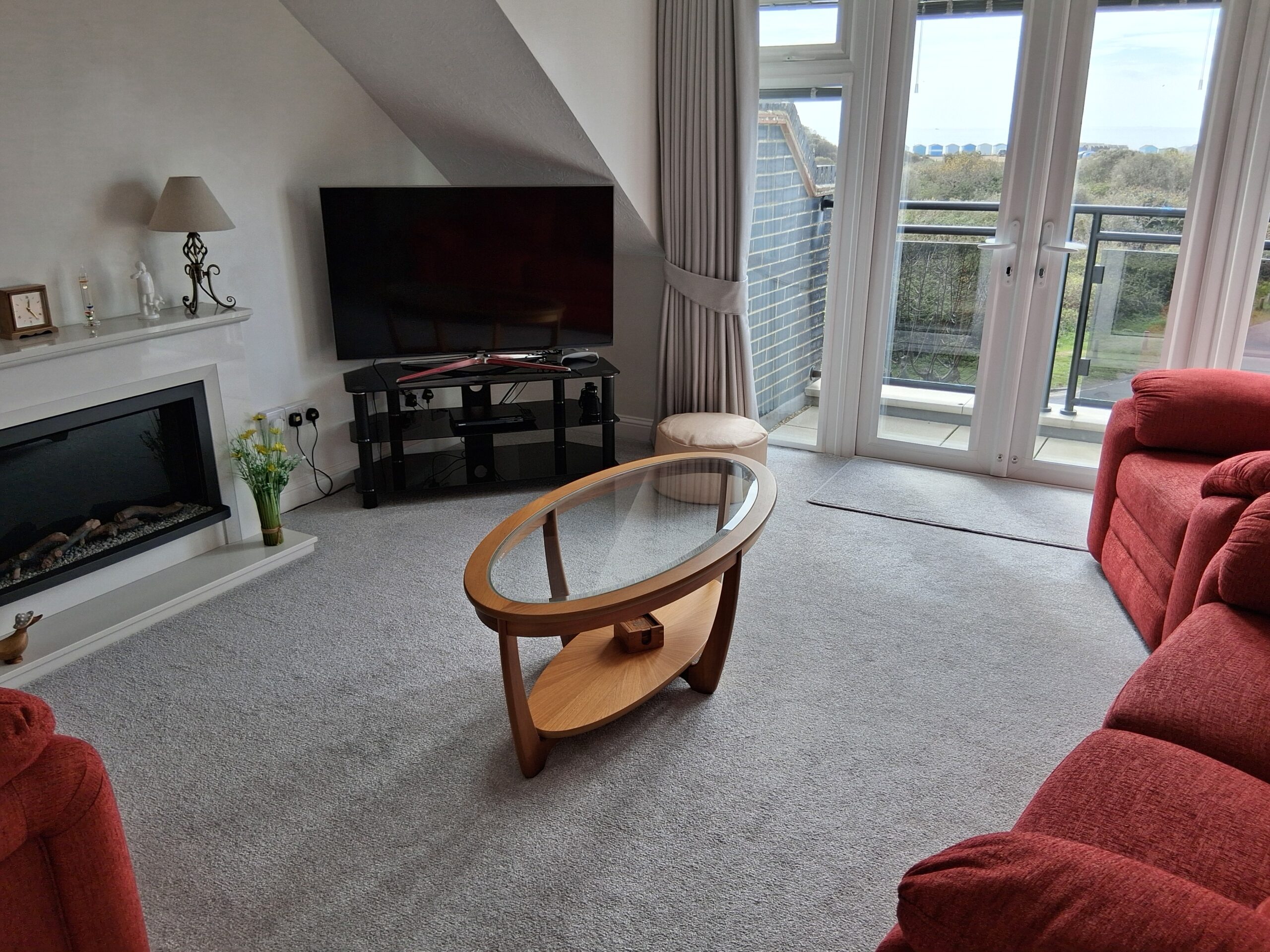 24’9” x 14’11” (7.54m x 4.54m) max. Feature modern fitted log effect electric fire with an attractive surround. Coved ceiling. Two television points. Three wall lights. Telephone point. Double glazed Velux picture window, (with a fitted blind), to the side. Double glazed Velux roof window, (with a fitted blind), to the side. South facing UPVC double glazed casement doors, (with two matching south facing UPVC double glazed side windows and fitted perfect fit blinds) to: your own 9’ (2.74m) South facing balcony, which has excellent views over the beach and towards the Solent and the Isle of Wight.