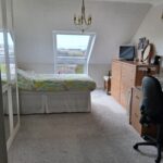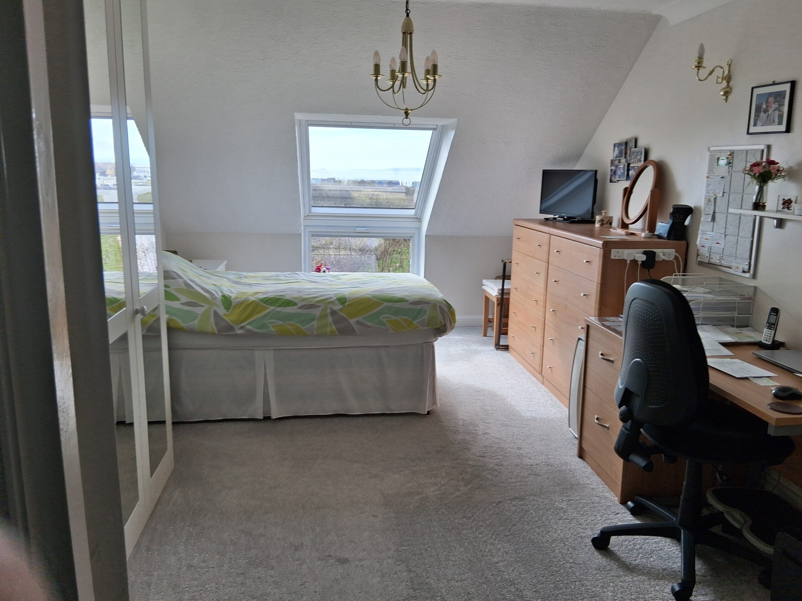12’7” x 9’10” (3.83m x 2.99m) max into the recess. Double glazed picture window, (with a fitted blind), to the side. Double glazed Velux roof window, (with a fitted blind), to the side. Coved ceiling. Range of attractive wardrobes. Wall light.