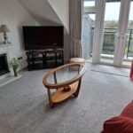 Fitted with an attractive suite. Low level WC. Feature vanity wash hand basin with mixer taps. Wide fully tiled shower enclosure with a Mira shower. Walls half tiled. Chrome heated towel rail/radiator. Extractor. Fitted mirror. Coved ceiling. Two built in cupboards.