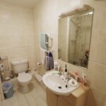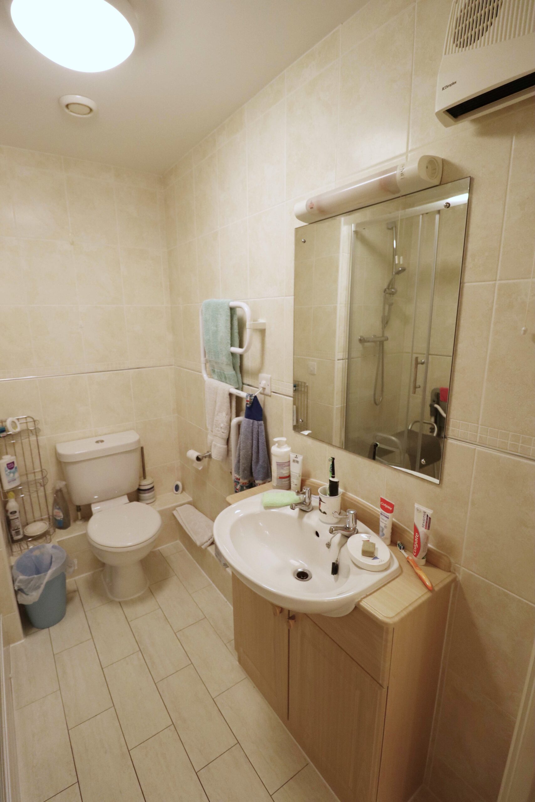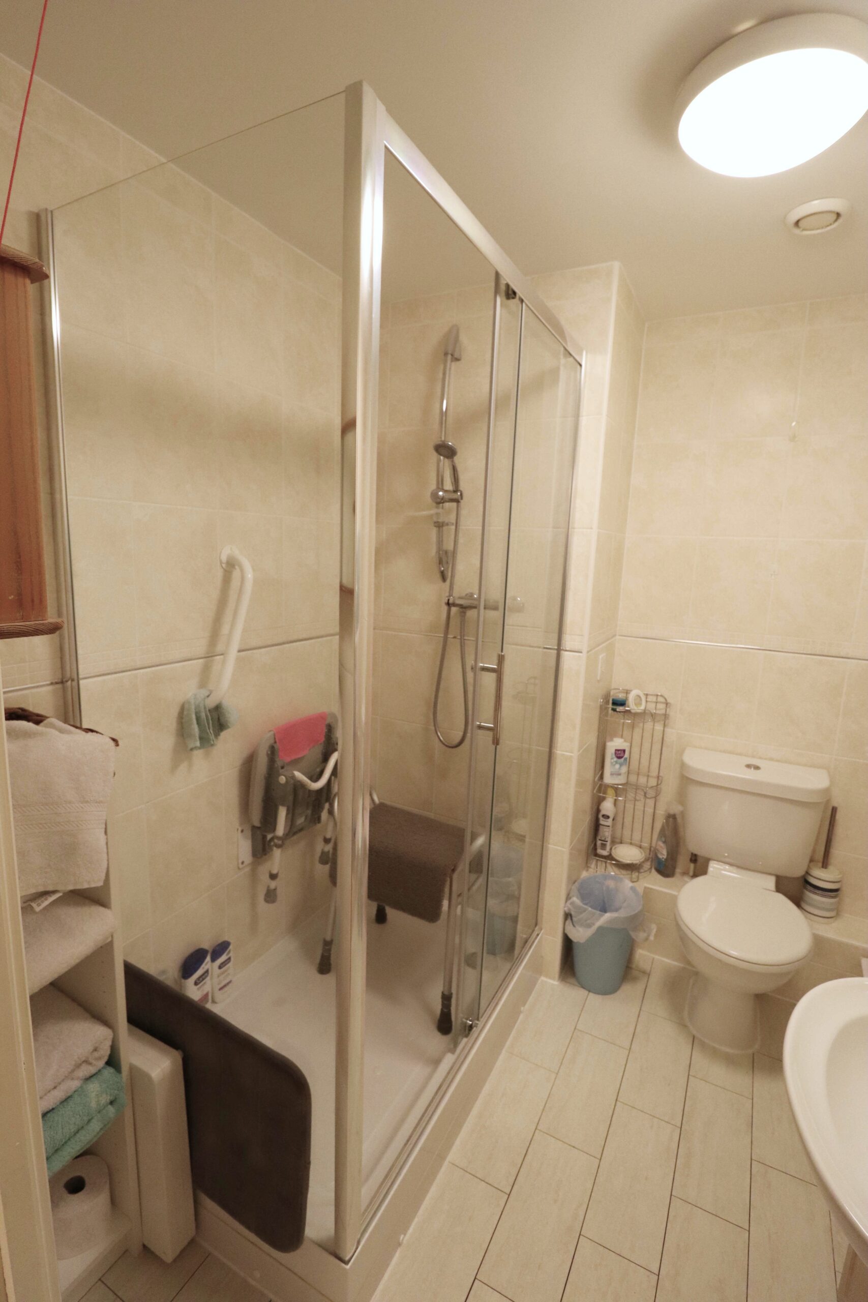 Shower enclosure with sliding door. Walls fully tiled. Low level WC. Vanity unit with inset wash hand basin and cupboard under. Emergency pull cord. Extractor. High level electric heater and heated towel rail.