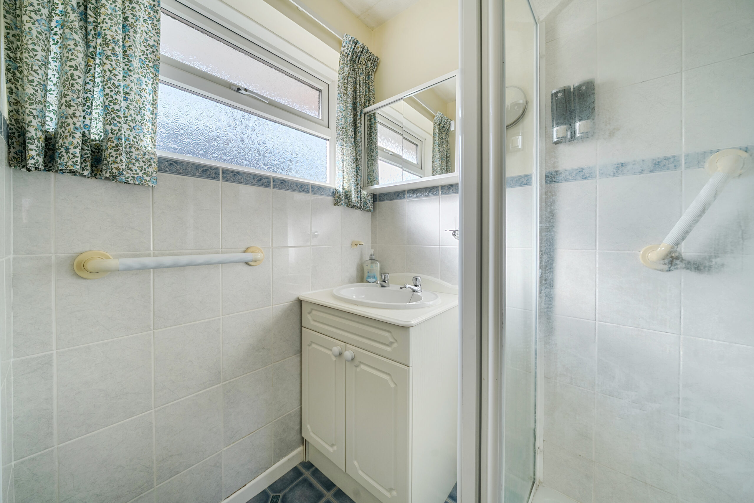 Fitted with a white suite. Feature vanity wash hand basin with a cupboard under. Wide fully tiled shower enclosure with a Mira shower. Walls half tiled. Radiator. Shaver point. UPVC double glazed window with obscured glass to the rear.