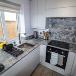 7’5” x 6’2” (2.26m x 1.87m) Fitted on three sides with attractive units. Range of worktops with drawers and cupboards under. Inset sink unit with mixer taps and a cupboard under. Matching high level cupboards. Built in Bosch oven with an inset Bosch four ring induction hob above. Concealed extractor over. Integral fridge/freezer. Integral Hotpoint washing machine. UPVC double glazed window to the side. Ceramic tiled floor. Four multi-directional ceiling spotlights.