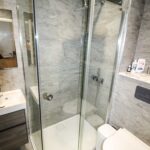 Fitted with attractive white suite. Low level WC. Feature vanity wash hand basin with mixer taps and a cupboard under. Fully tiled shower enclosure with both a hand and a drencher shower. Feature heated towel rail/radiator. Walls fully tiled. Ceramic tiled floor. Inset ceiling spotlights. Two extractors. Fitted mirror. Fitted electric toothbrush charger.
