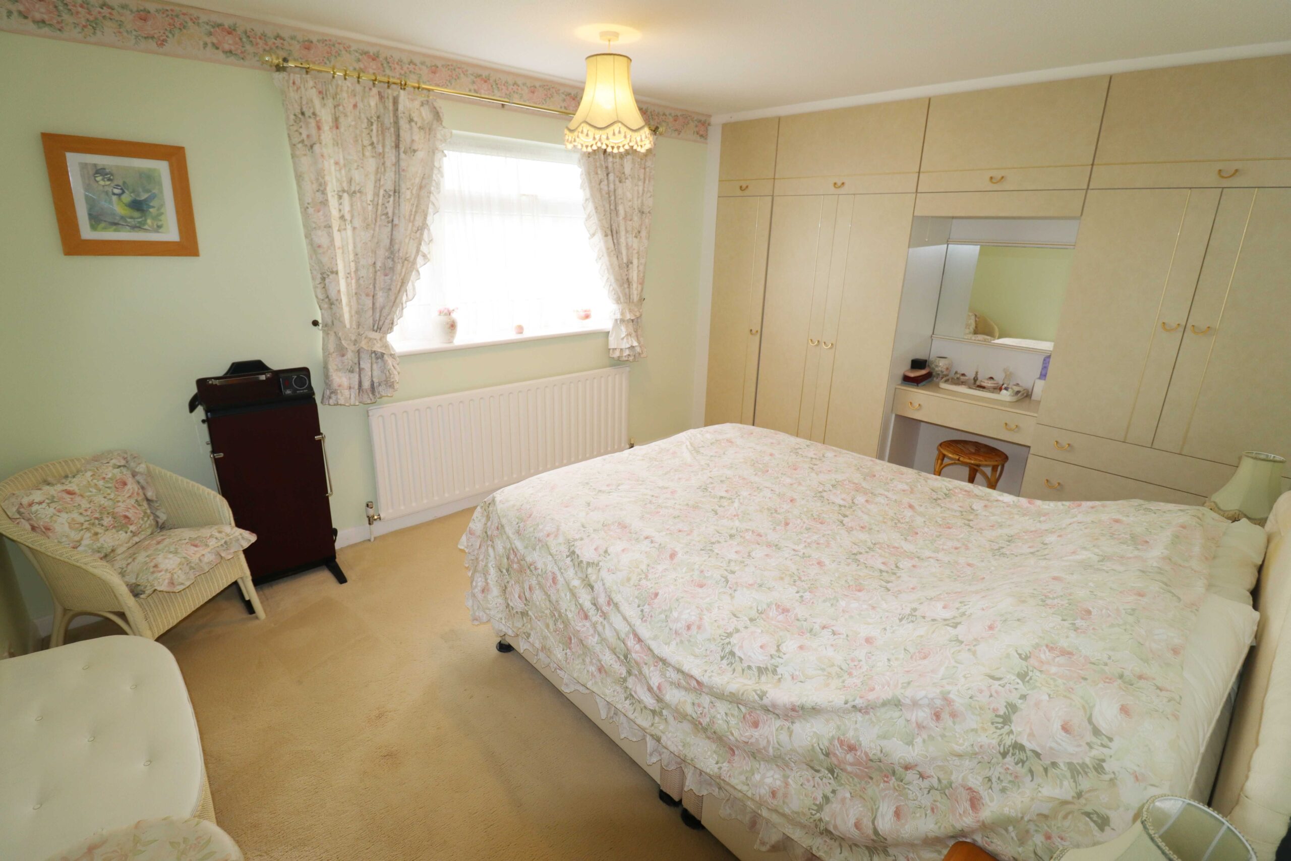 10’7” x 10’4” (3.22m x 3.14m) South facing UPVC double glazed window to the rear. Radiator. Coved ceiling. Access to the loft space. Double door built in wardrobe.
