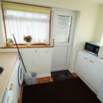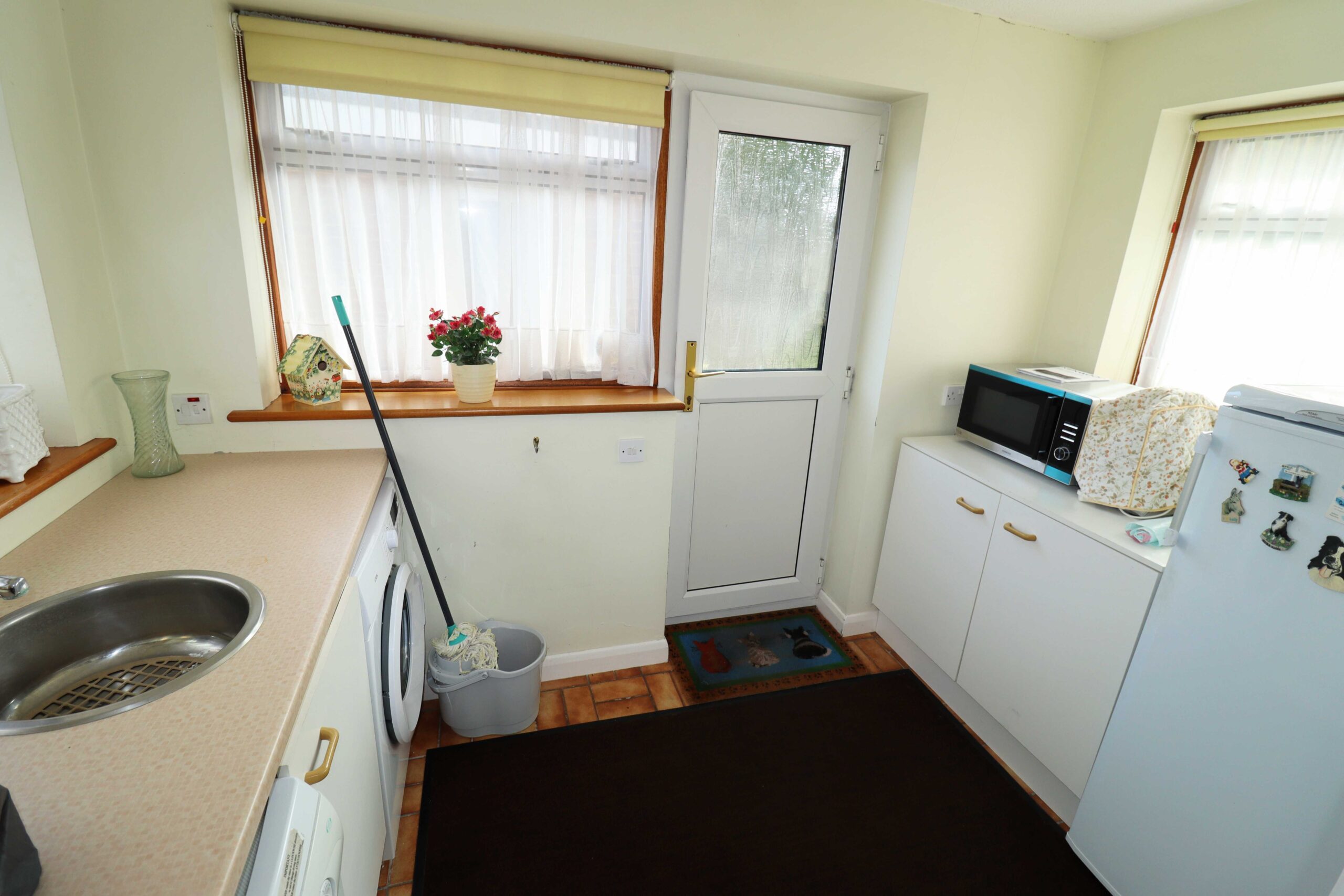 10’ x 5’8” (3.04m x 1.79m) Worktop. Inset circular stainless steel sink unit with mixer taps and a cupboard under. Recess with plumbing for a washing machine. Recess for a tumble dryer. Recess for a fridge/freezer. Walls part tiled. Two UPVC double glazed windows to the side. South facing UPVC double glazed window to the rear.