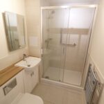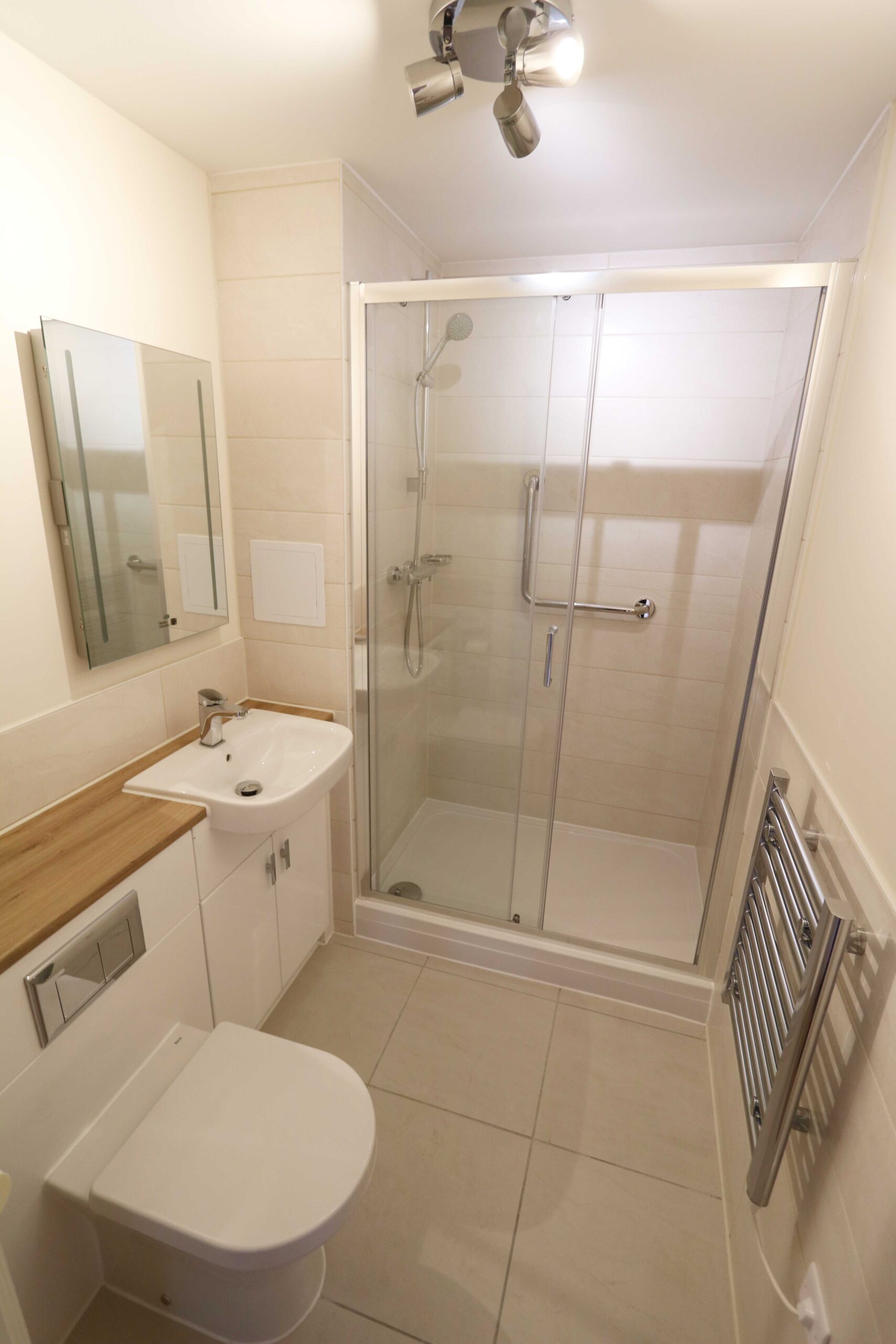Fitted with an attractive white suite. Low level WC. Feature vanity wash hand basin with mixer taps and a cupboard under. Wide fully tiled shower enclosure with a mixer shower. Ceramic tiled floor. Extractor. Walls part tiled. Fitted mirror with lighting.