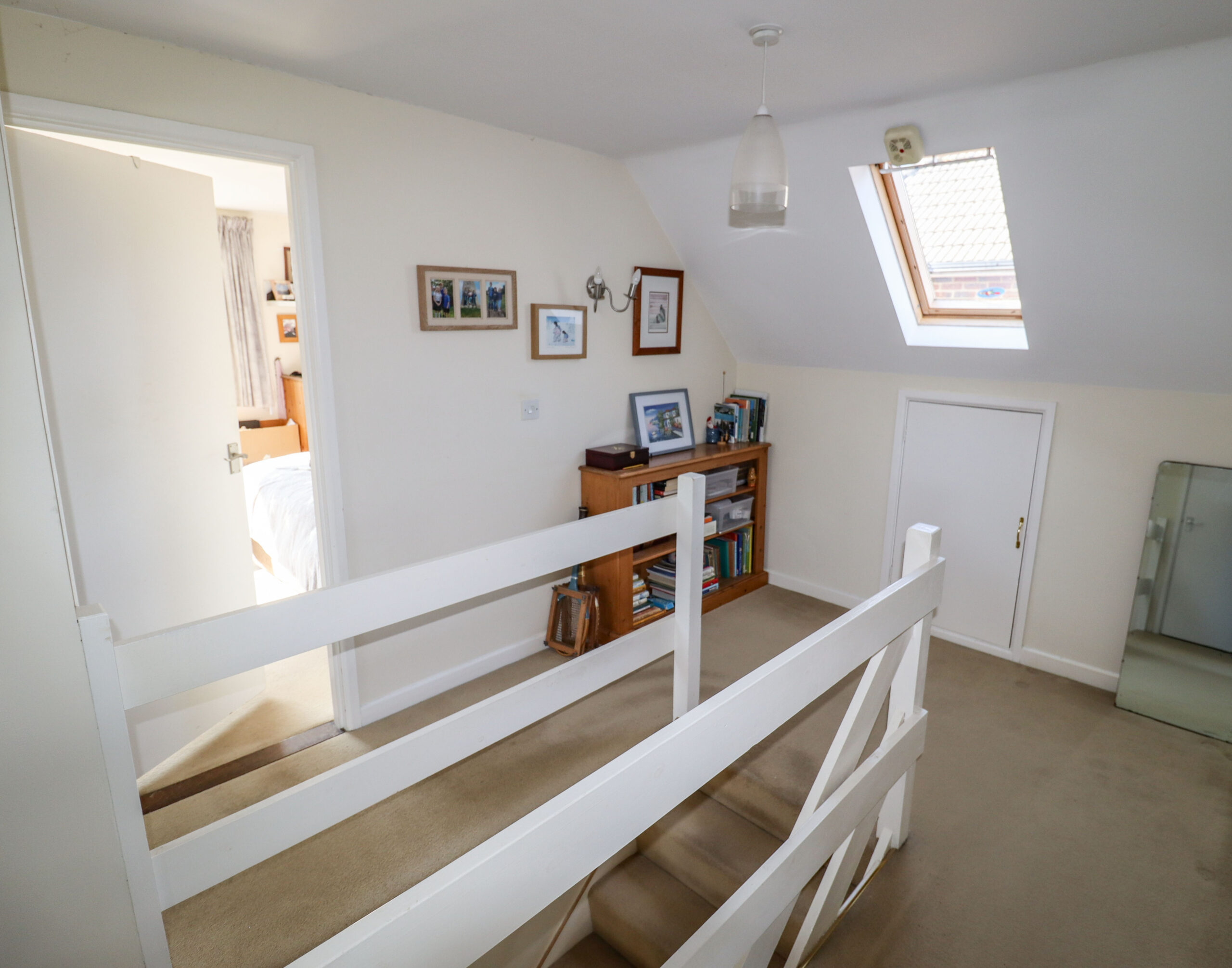 Access to the loft space. Wall light. Door to the eaves storage space. Double glazed Velux roof window to the side. Spacious walk in cupboard. Doors to:
