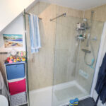 Fitted with an attractive white suite. Low level WC. Pedestal wash hand basin with mixer taps. Wide fully tiled shower enclosure with a mixer shower. Walls half tiled. Chrome heated towel rail/radiator. Four multi-directional ceiling spotlights. UPVC double glazed window with obscured glass to the side.