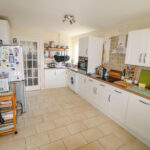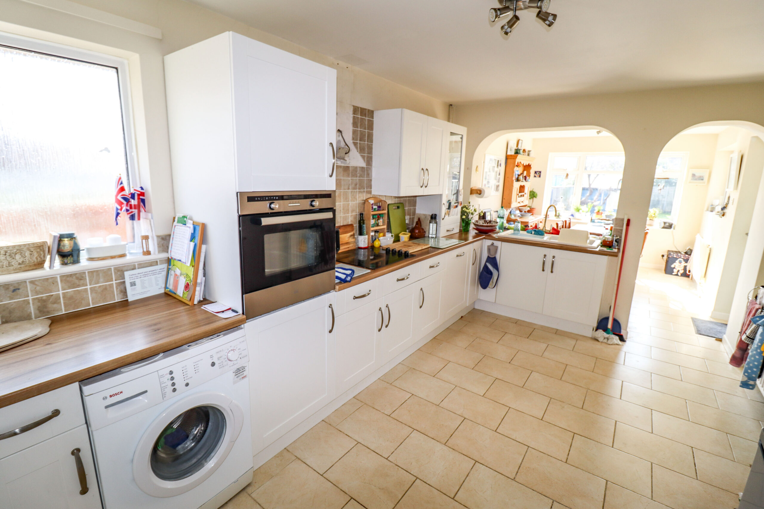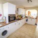 15’2” x 9’10” (4.62m x 2.99m) Fitted on all sides. Range of worktops with drawers and cupboards under. Inset single drainer sink unit with mixer taps and a cupboard under. Matching high level cupboards, (including a display cupboard). Built in Cooke and Lewis stainless steel oven. Inset Lamona four ring ceramic hob. Integral dishwasher. Recess with plumbing for a washing machine. Space for a fridge/freezer. Walls part tiled. Ceramic tiled floor. Radiator. UPVC double glazed window to the side. Return door to the hallway. Four multi-directional ceiling spotlights. Access through to: