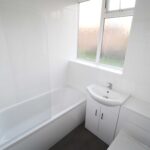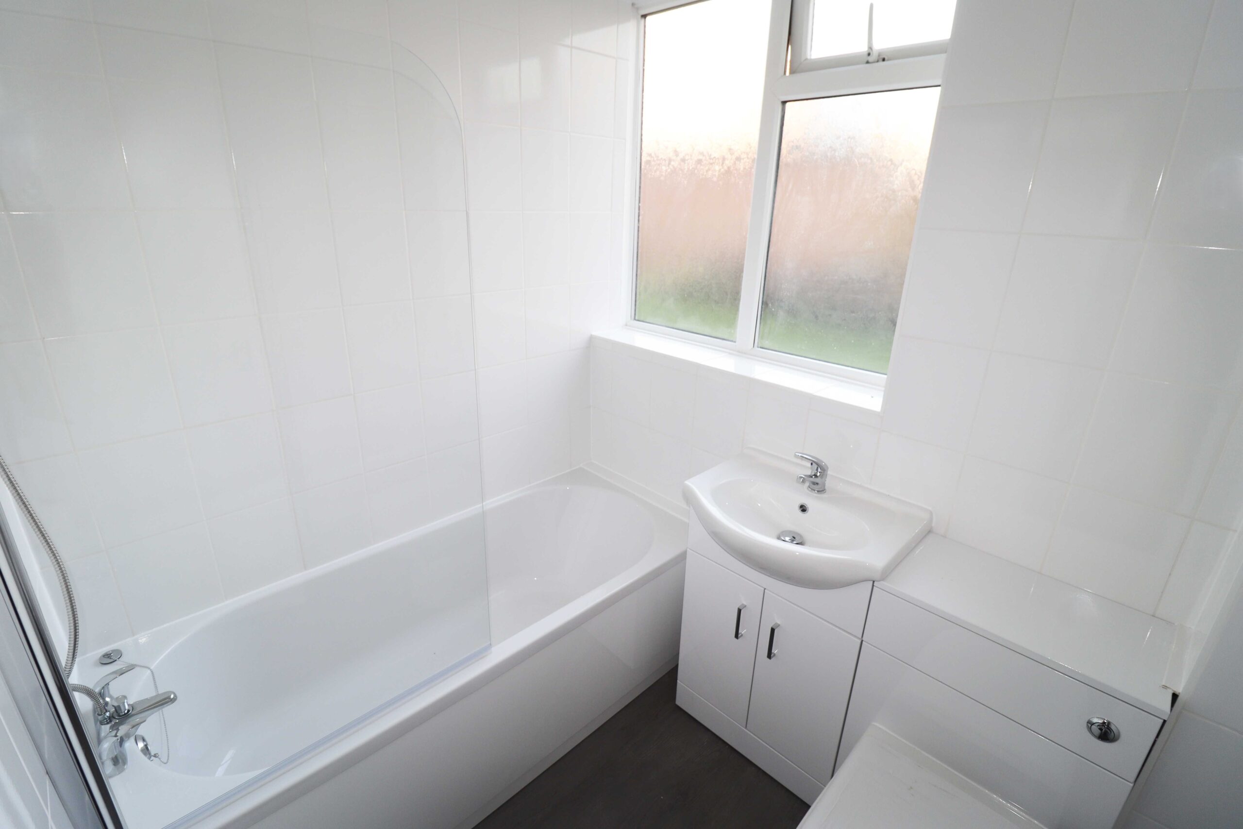 Fitted with an attractive white suite. Low level WC. Feature vanity wash hand basin with mixer taps and a cupboard under. Panelled bath with mixer taps and a hand shower. Side screen. Chrome heated towel rail/radiator. Walls fully tiled. UPVC double glazed window with obscured glass to the rear.